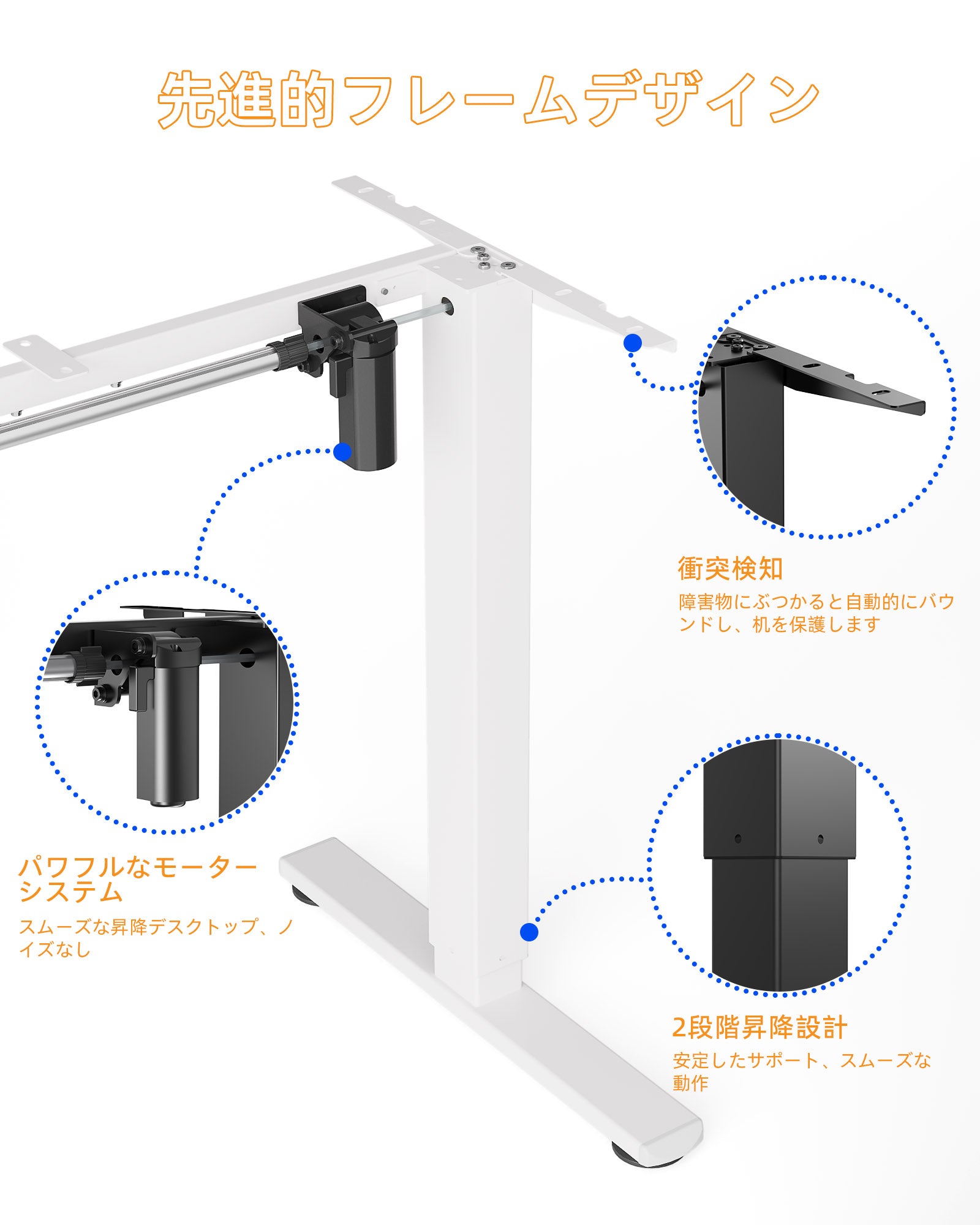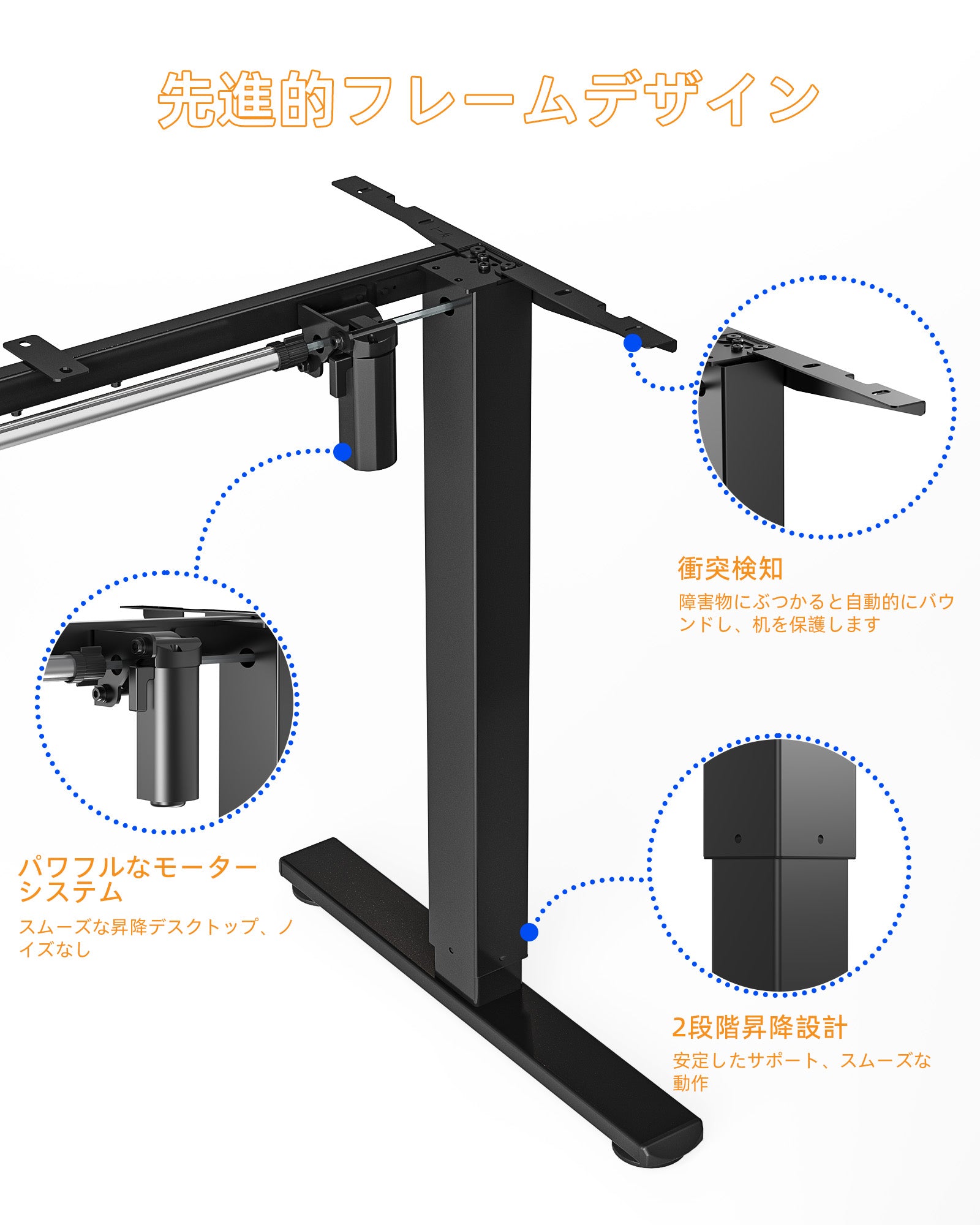 この電動昇降デスクは、頑丈なスチールフレームと航空級の昇降柱コネクタを採用しており、5万回のテスト後も安定性と安全性を保ち、最高の高さでも信頼性のある動作が可能です