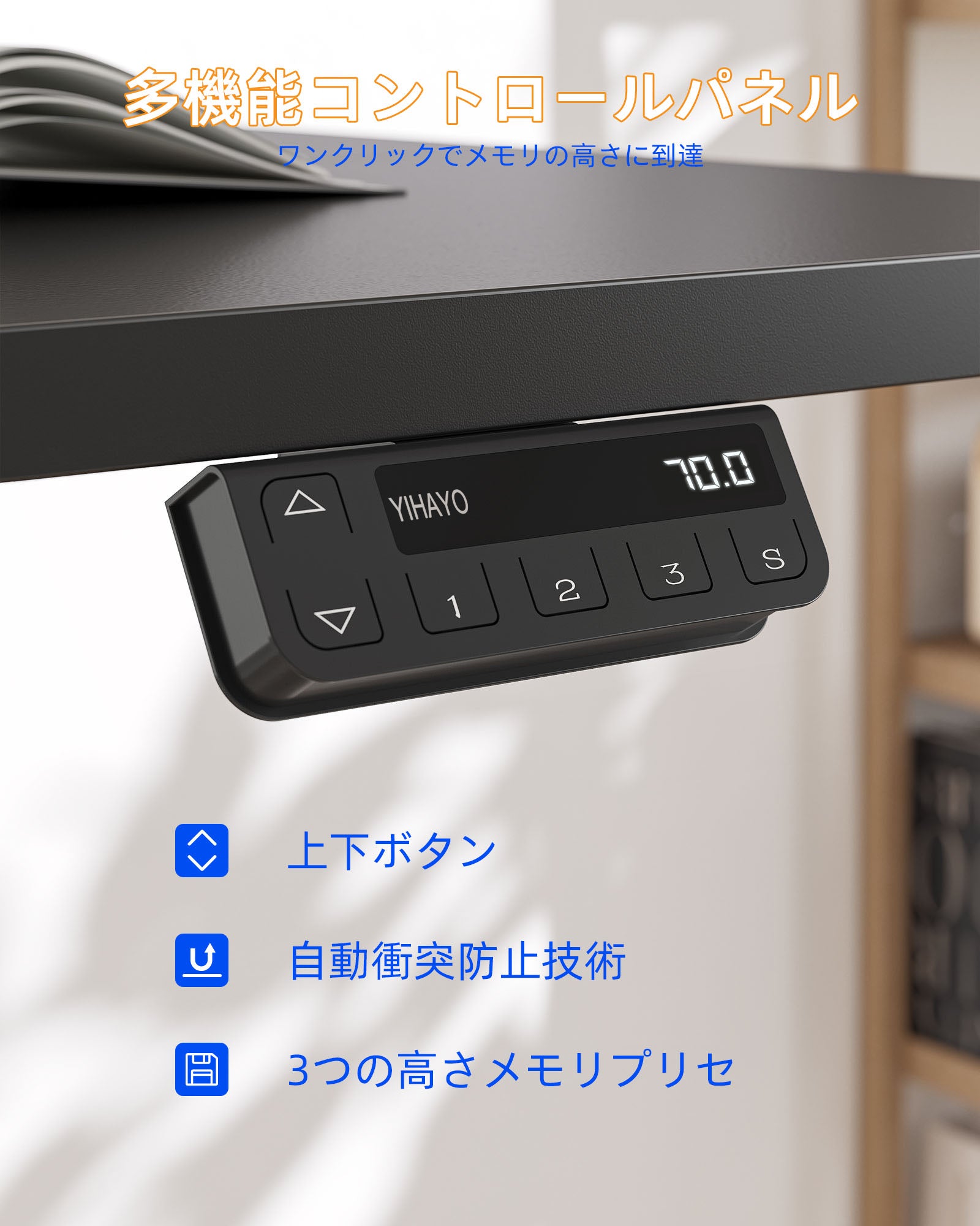 YIHAYO電動昇降デスクは、衝突防止技術も搭載しており、センサーが移動経路上の障害物を検知することで、昇降デスクと障害物の衝突や擦れを効果的に防止し、より安全な使用体験を提供します