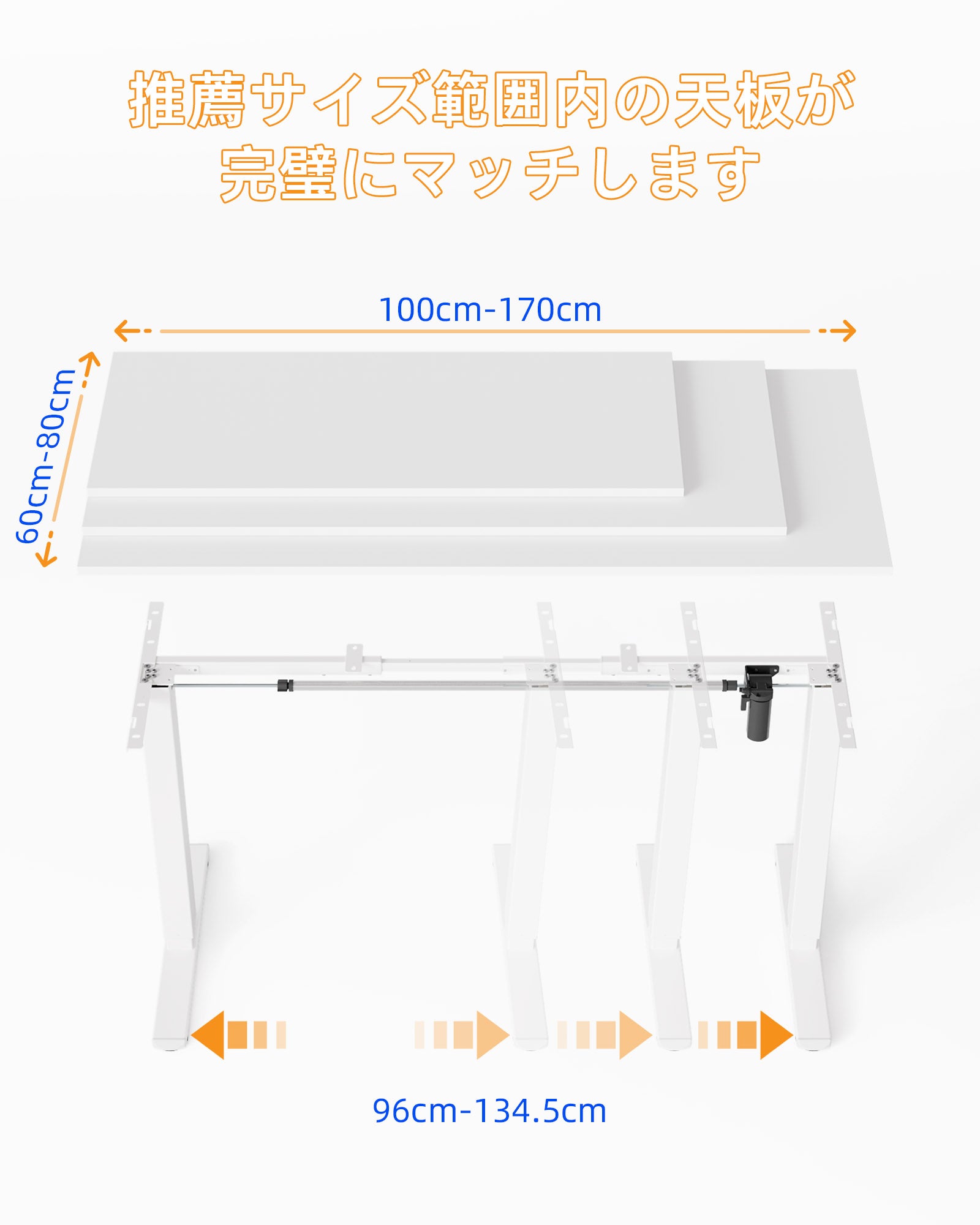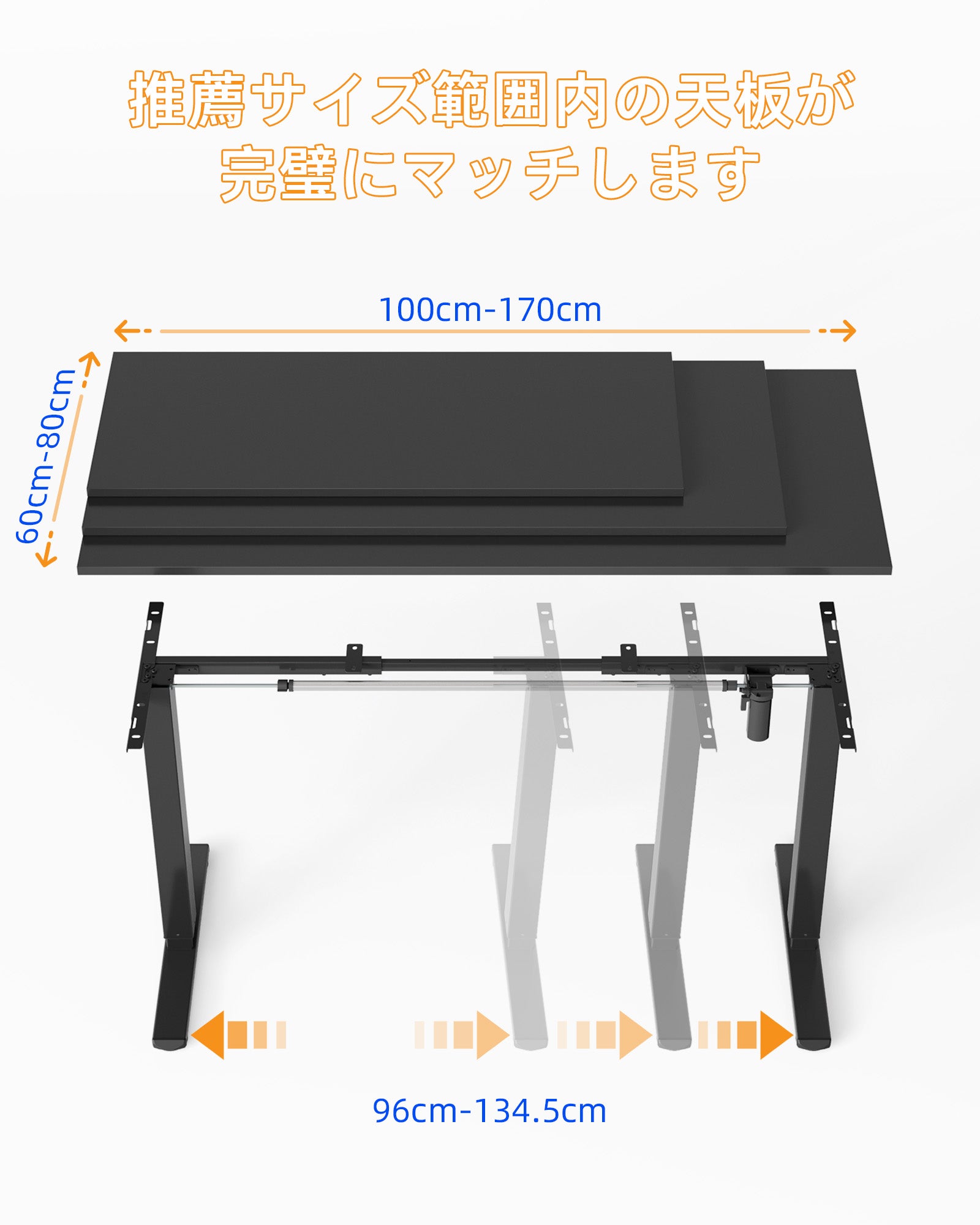 YIHAYOの電動昇降デスク脚は、拡張可能なデザインを採用しており、伸ばす範囲は96cmから134.5cmまで可能です。幅100cmから170cm、奥行き60cmから80cmのデスクトップに対応し、各自のニーズに合わせて自由に組み合わせることができます。同時に、このフレームには優れた耐荷重能力と垂直昇降駆動力があり、最大70KGの重量を安定して支持することができます。
