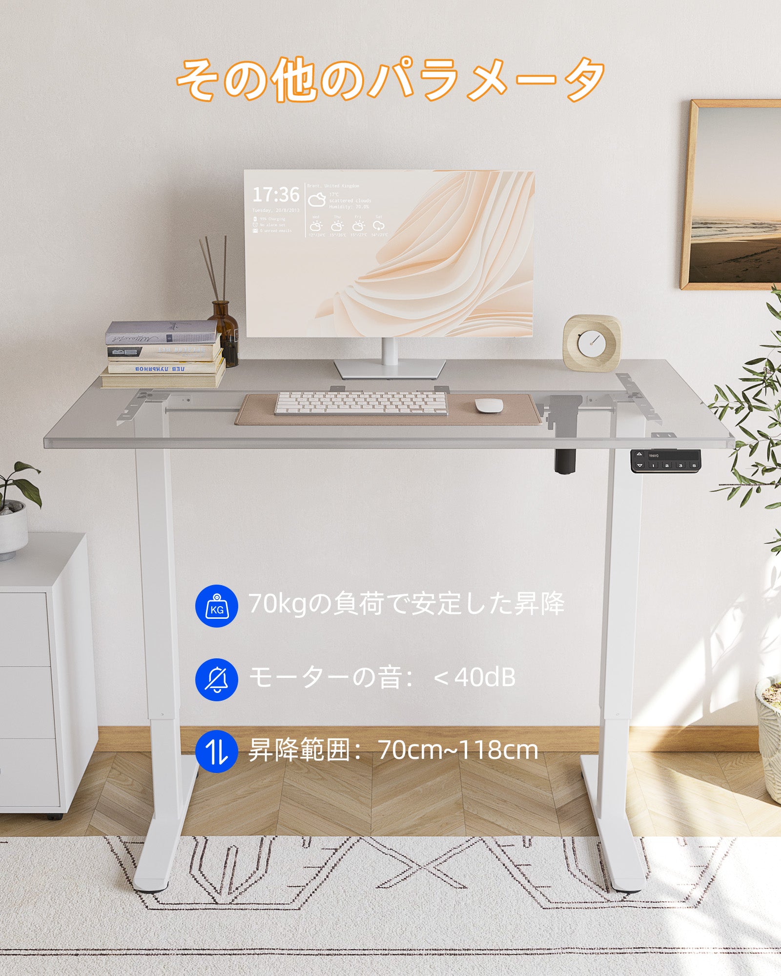 YIHAYOの電動昇降デスク脚は、高さを70cmから118cmまで自由に調整することができます。子供であっても大人であっても、身長や姿勢に合わせて設定することが可能です。さらに、最大3つの高さを記憶する機能が付いており、ボタン一つで座位と立位を切り替えることができ、お好みの高さに合わせることができます。