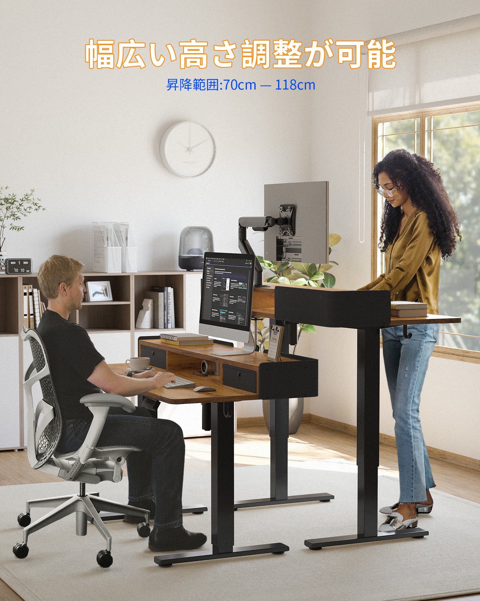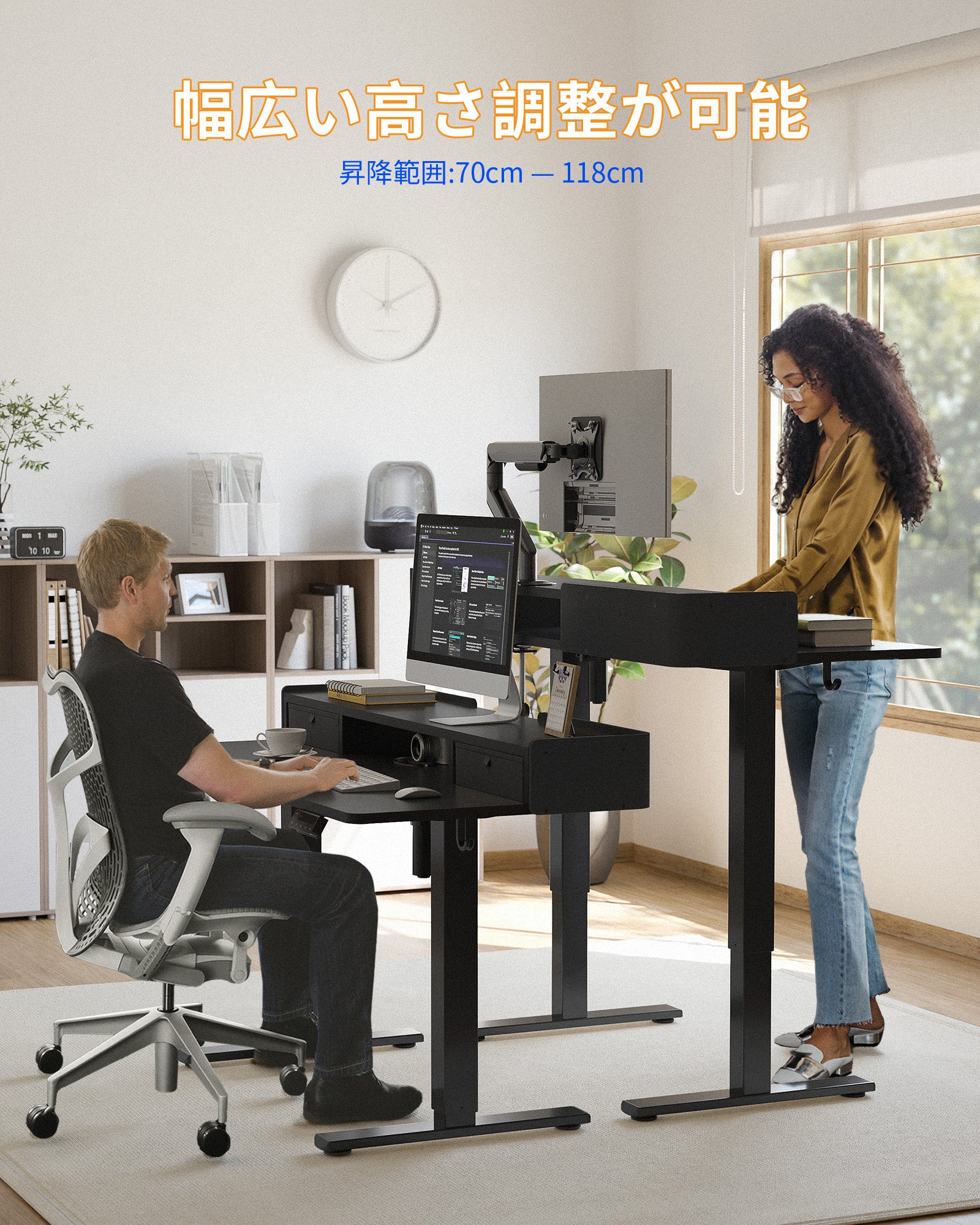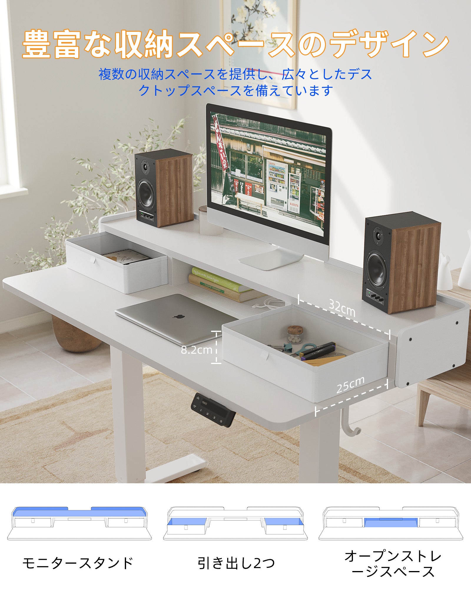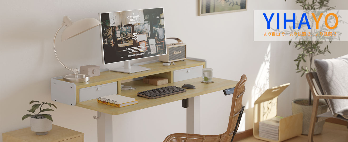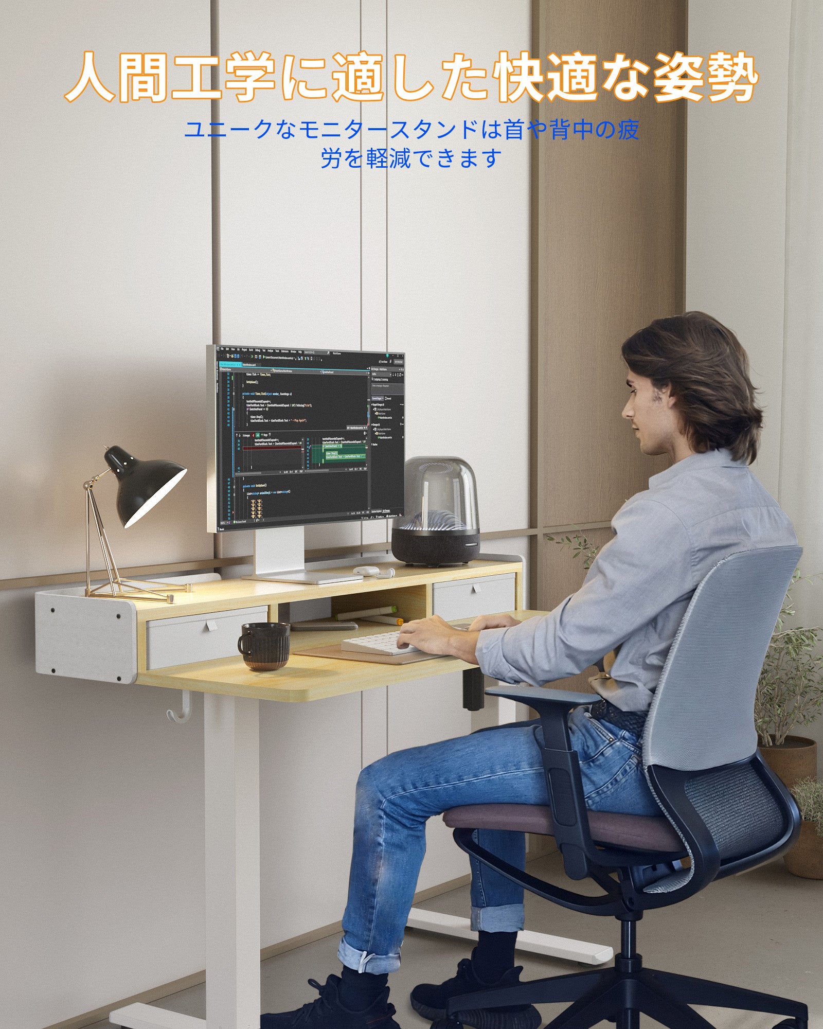 YIHAYOの電動昇降デスクには、モニターなどのデバイスを置くためのモニタースタンドがあり、視線を画面と平行に保つことができ、首や背中の圧力を軽減するのに役立ちます。二つの布製の引き出しがあなたの物をたっぷりと収納するスペースを提供し、ファイル、本、ケーブルなどを収納することができ、デスクを整理整頓された状態に保つのに役立ちます。この昇降デスクには、ヘッドフォンフックやデスクトップケーブル収納穴も装備され、整理されたワークスペースを作り出すことができます