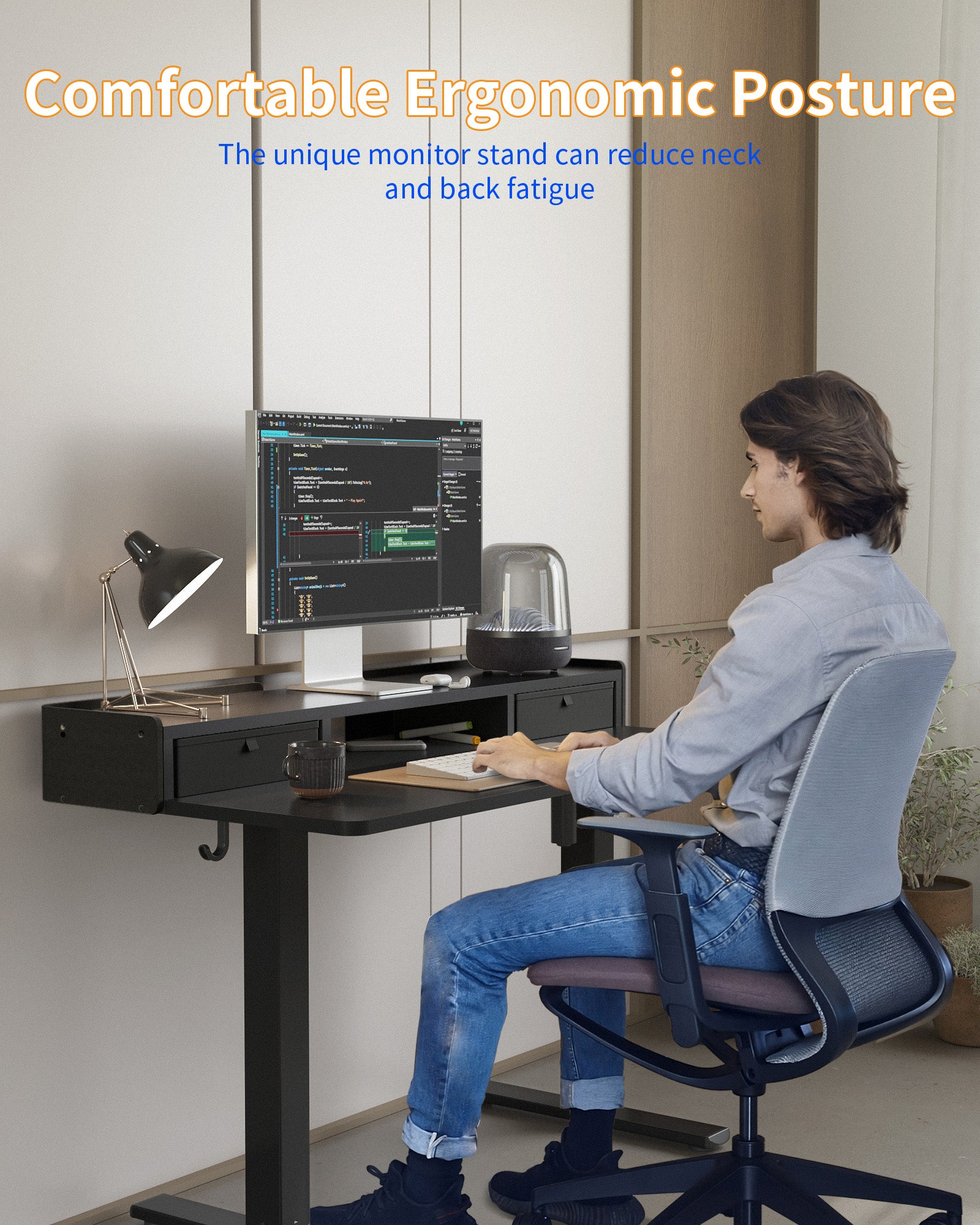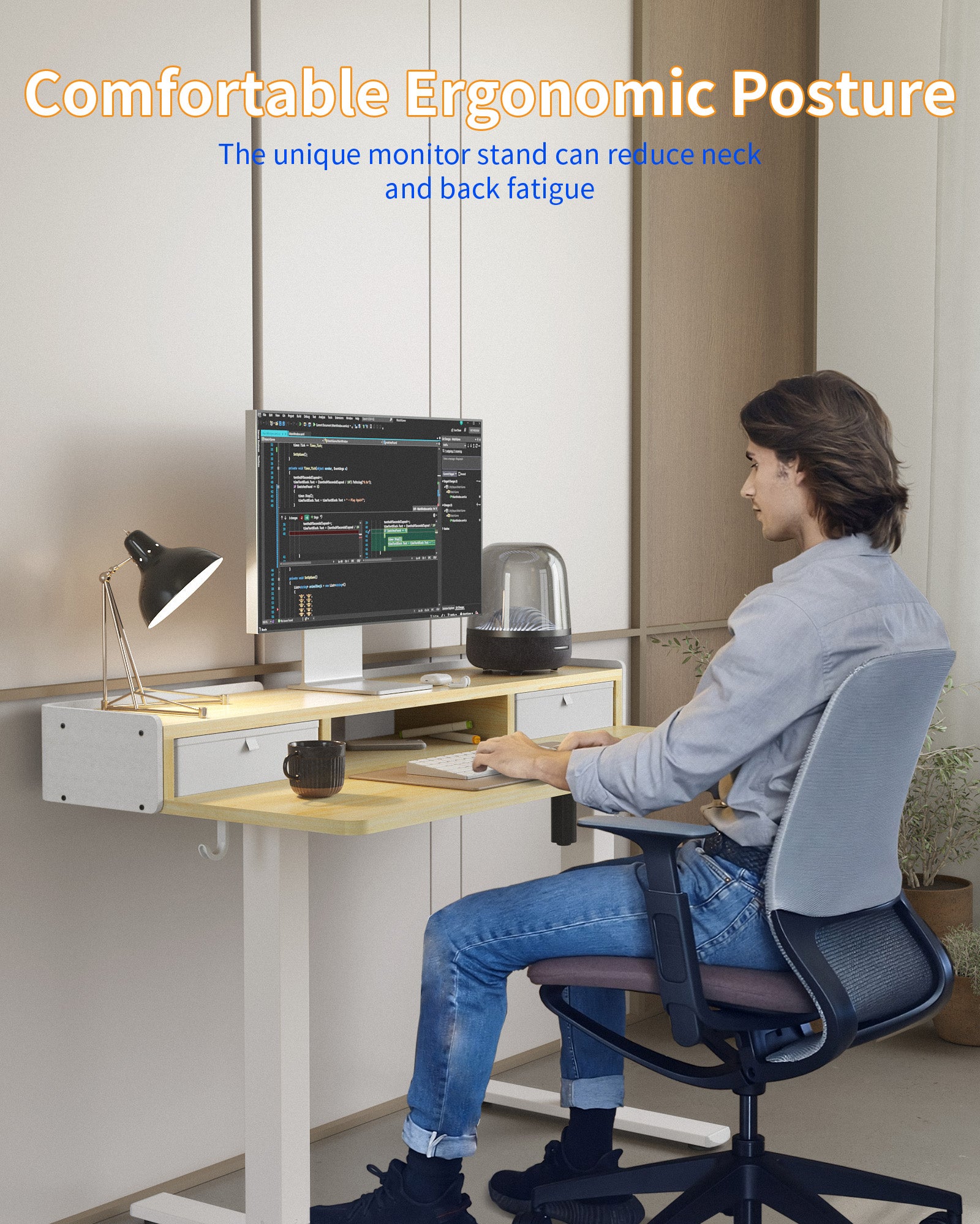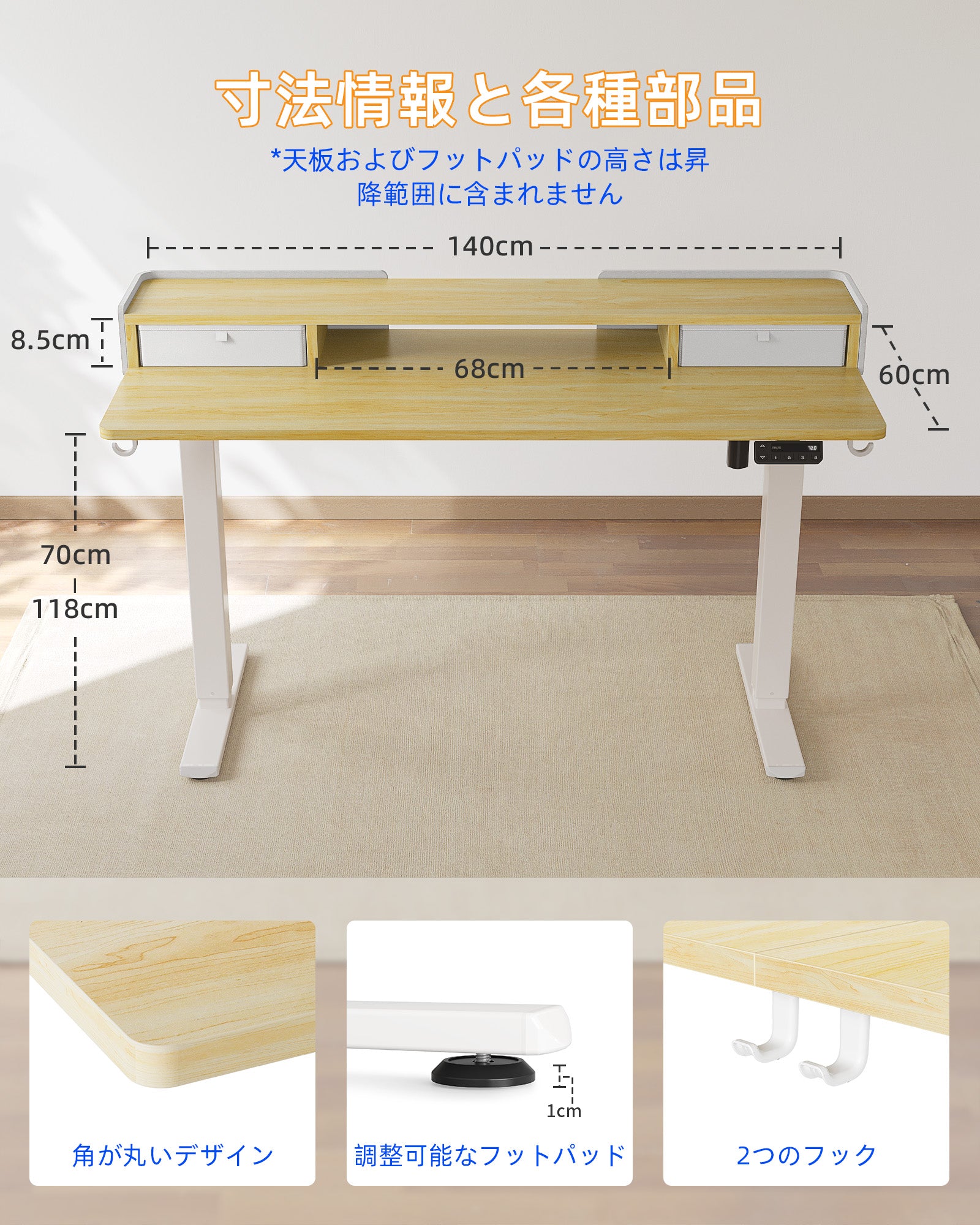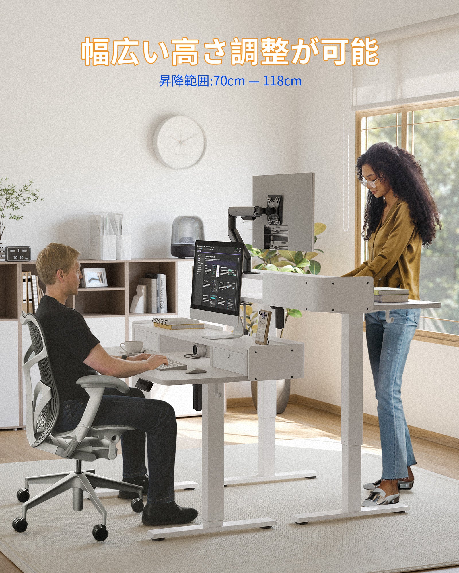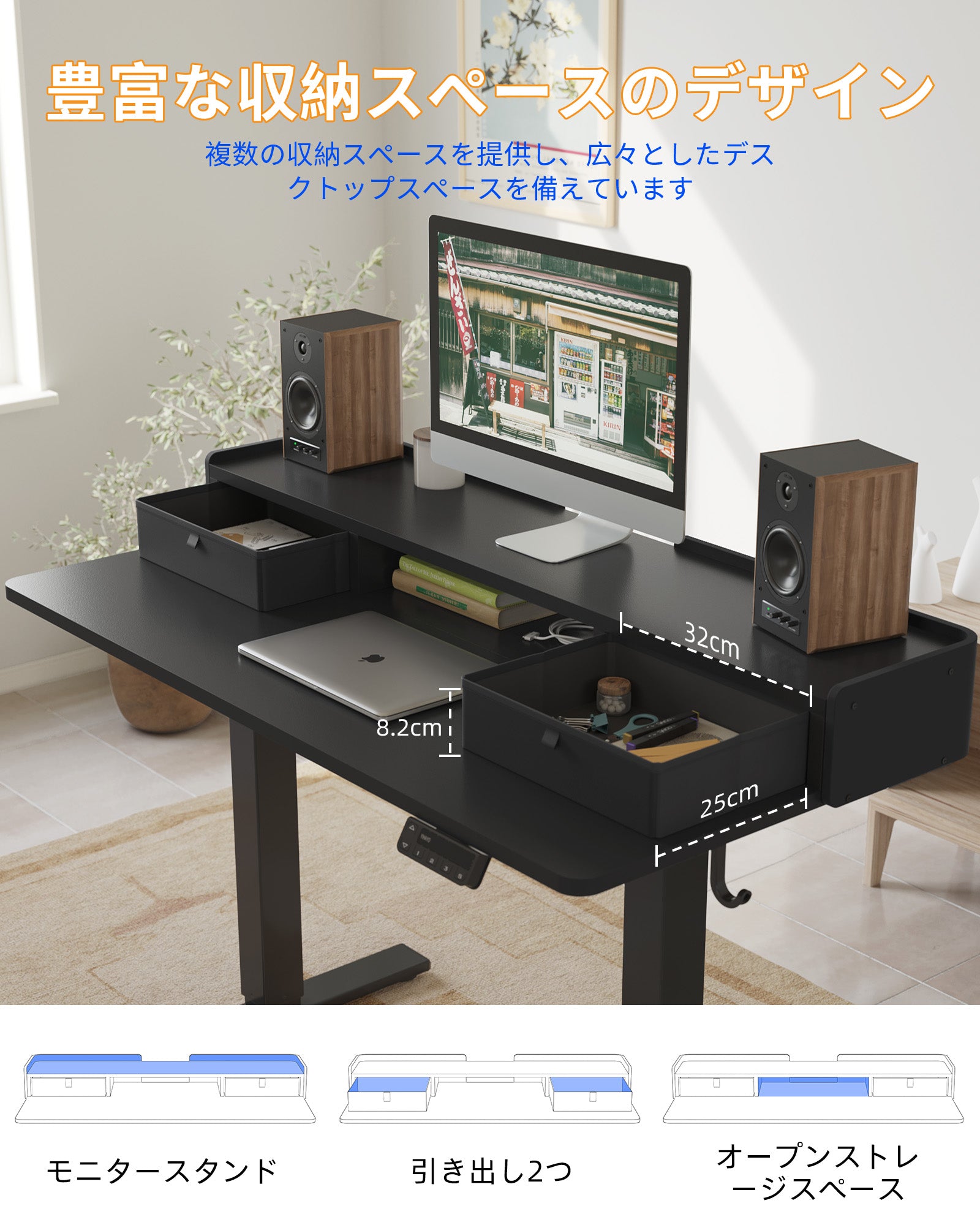 YIHAYOの電動昇降デスクには、モニターなどのデバイスを置くためのモニタースタンドがあり、視線を画面と平行に保つことができ、首や背中の圧力を軽減するのに役立ちます。二つの布製の引き出しがあなたの物をたっぷりと収納するスペースを提供し、ファイル、本、ケーブルなどを収納することができ、デスクを整理整頓された状態に保つのに役立ちます。この昇降デスクには、ヘッドフォンフックやデスクトップケーブル収納穴も装備され、整理されたワークスペースを作り出すことができます
