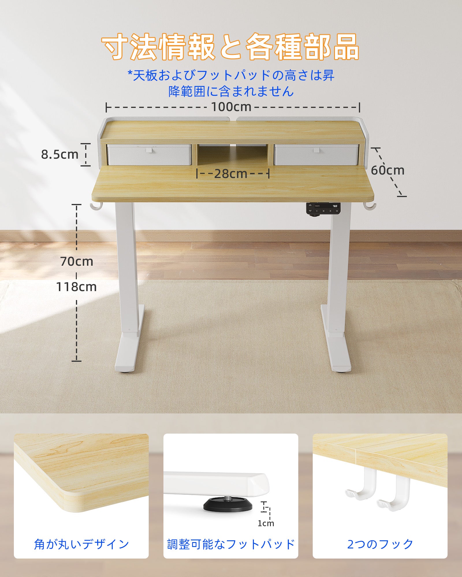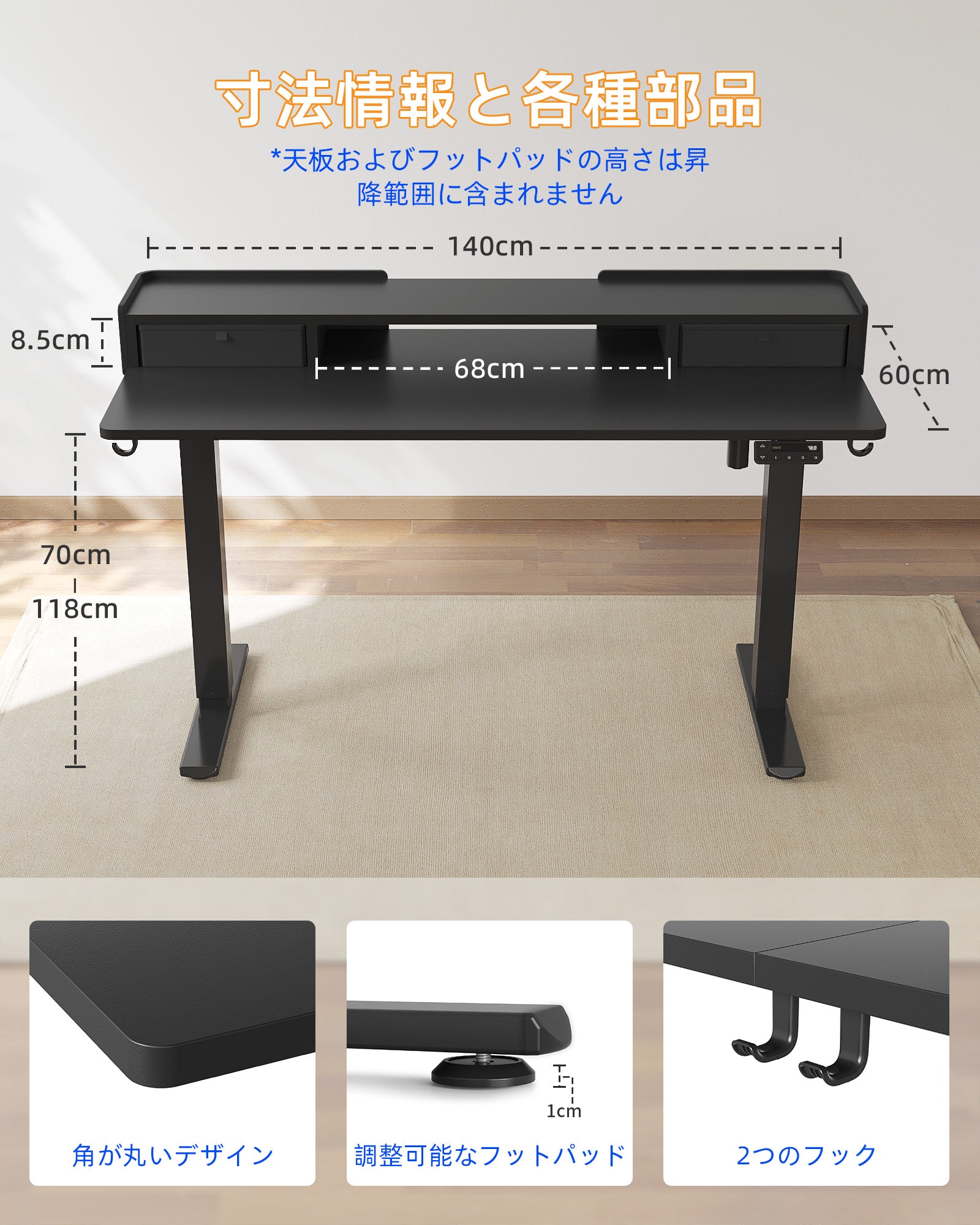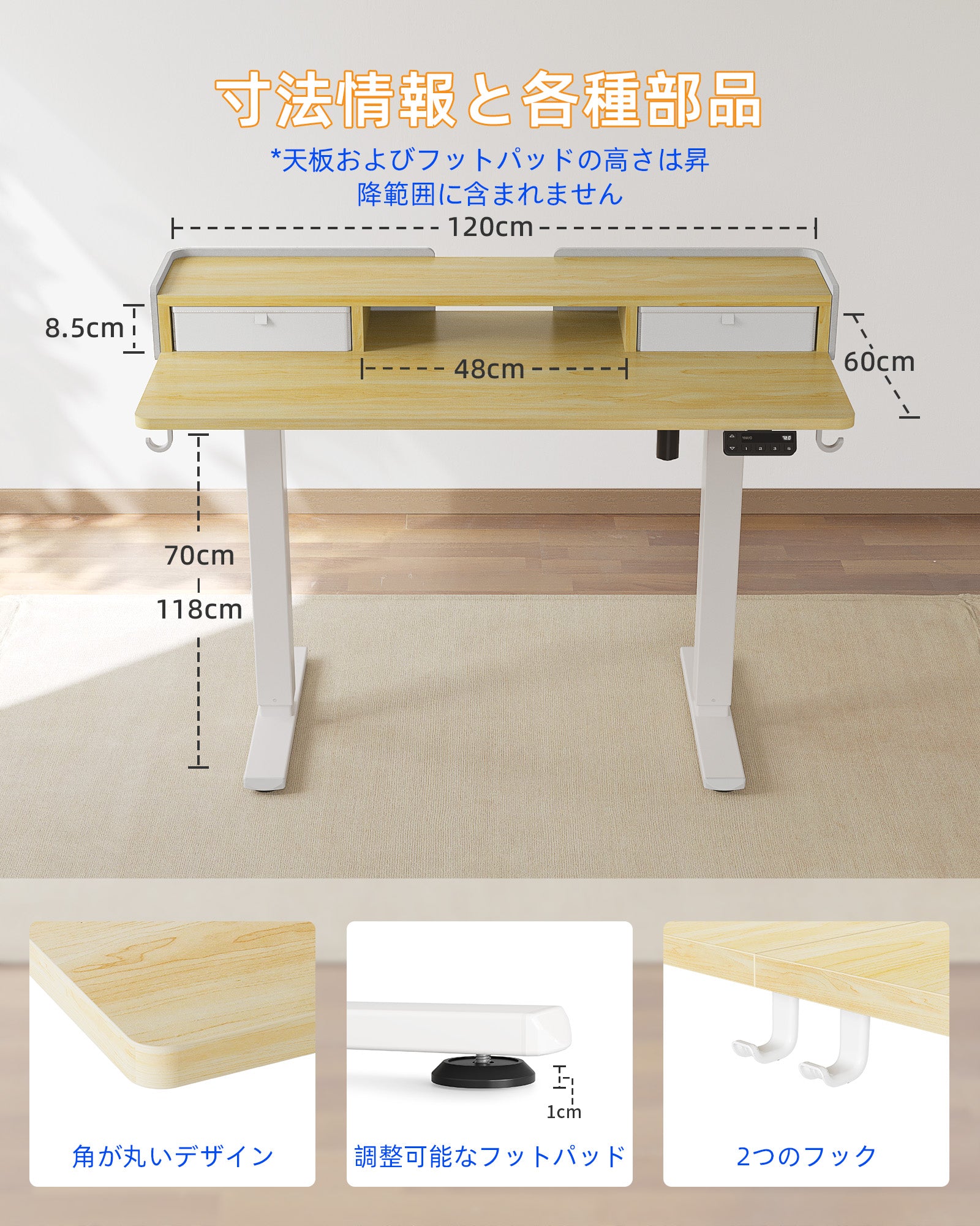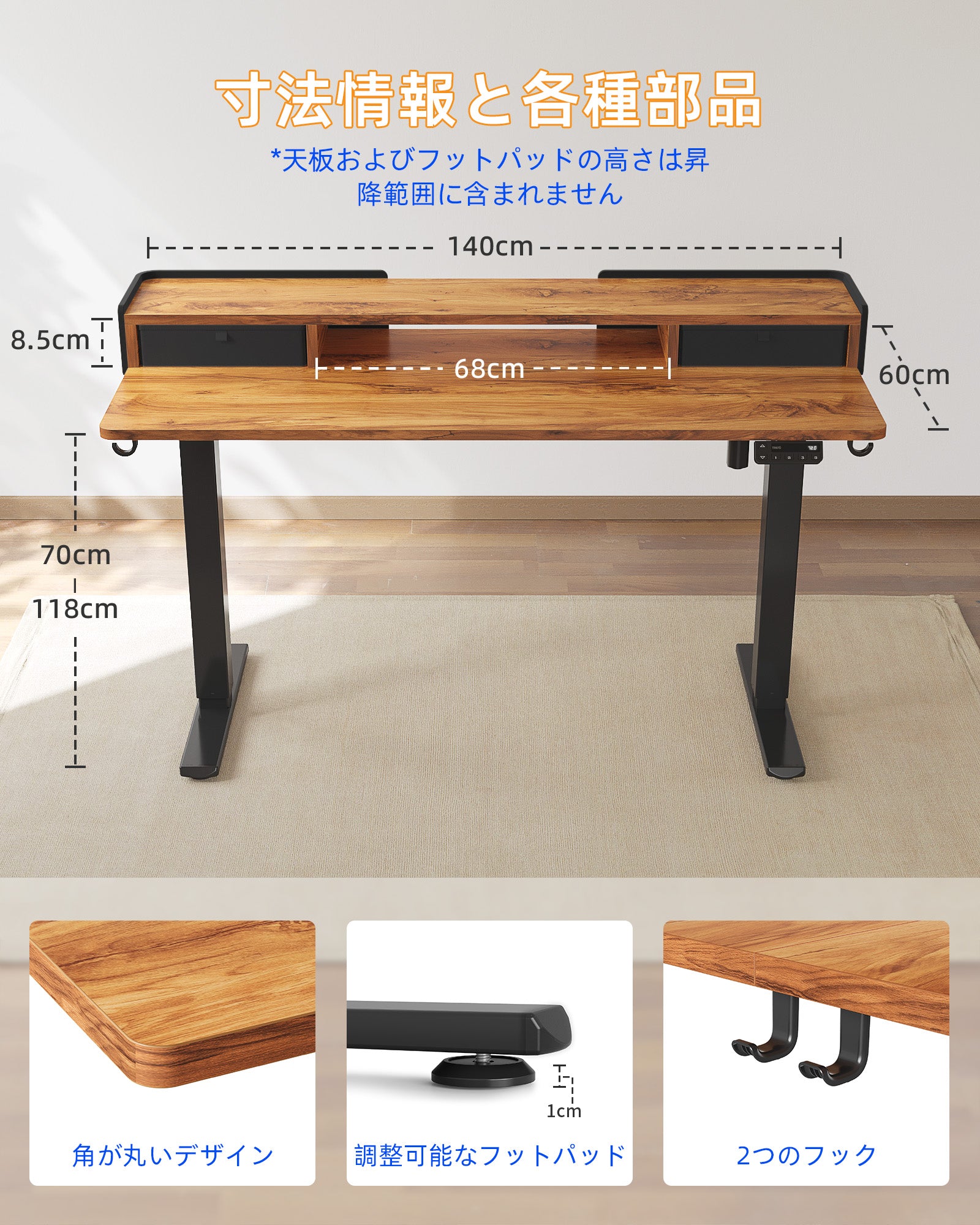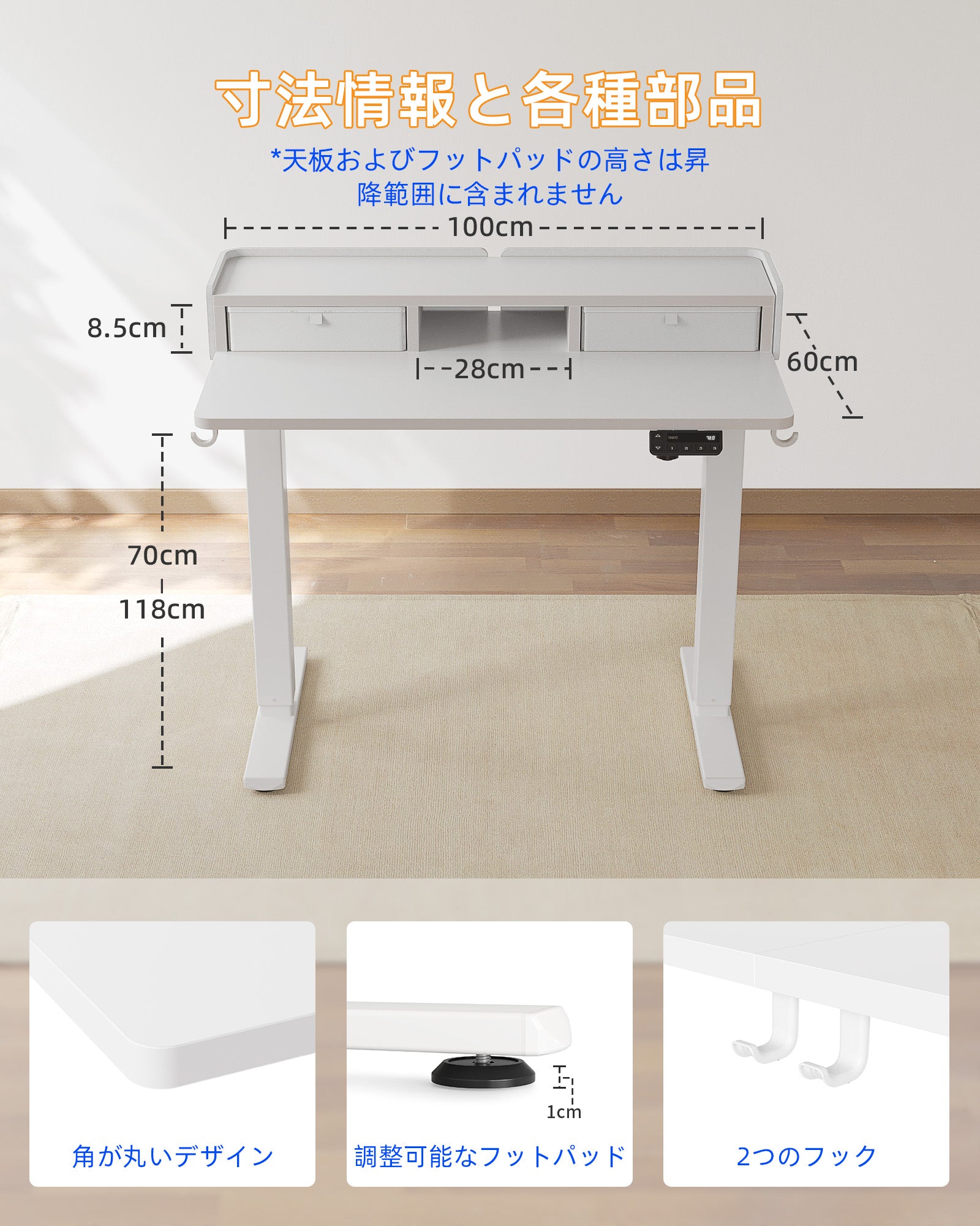 YIHAYOの電動昇降デスクには、モニターなどのデバイスを置くためのモニタースタンドがあり、視線を画面と平行に保つことができ、首や背中の圧力を軽減するのに役立ちます。二つの布製の引き出しがあなたの物をたっぷりと収納するスペースを提供し、ファイル、本、ケーブルなどを収納することができ、デスクを整理整頓された状態に保つのに役立ちます。この昇降デスクには、ヘッドフォンフックやデスクトップケーブル収納穴も装備され、整理されたワークスペースを作り出すことができます