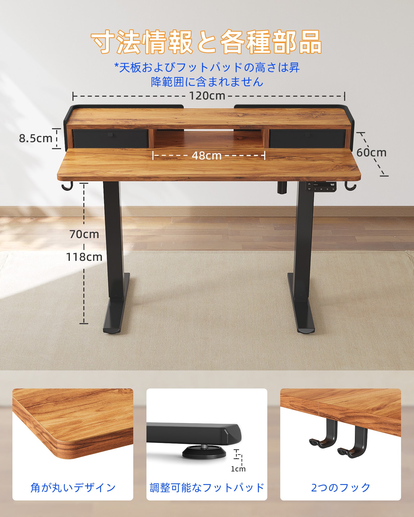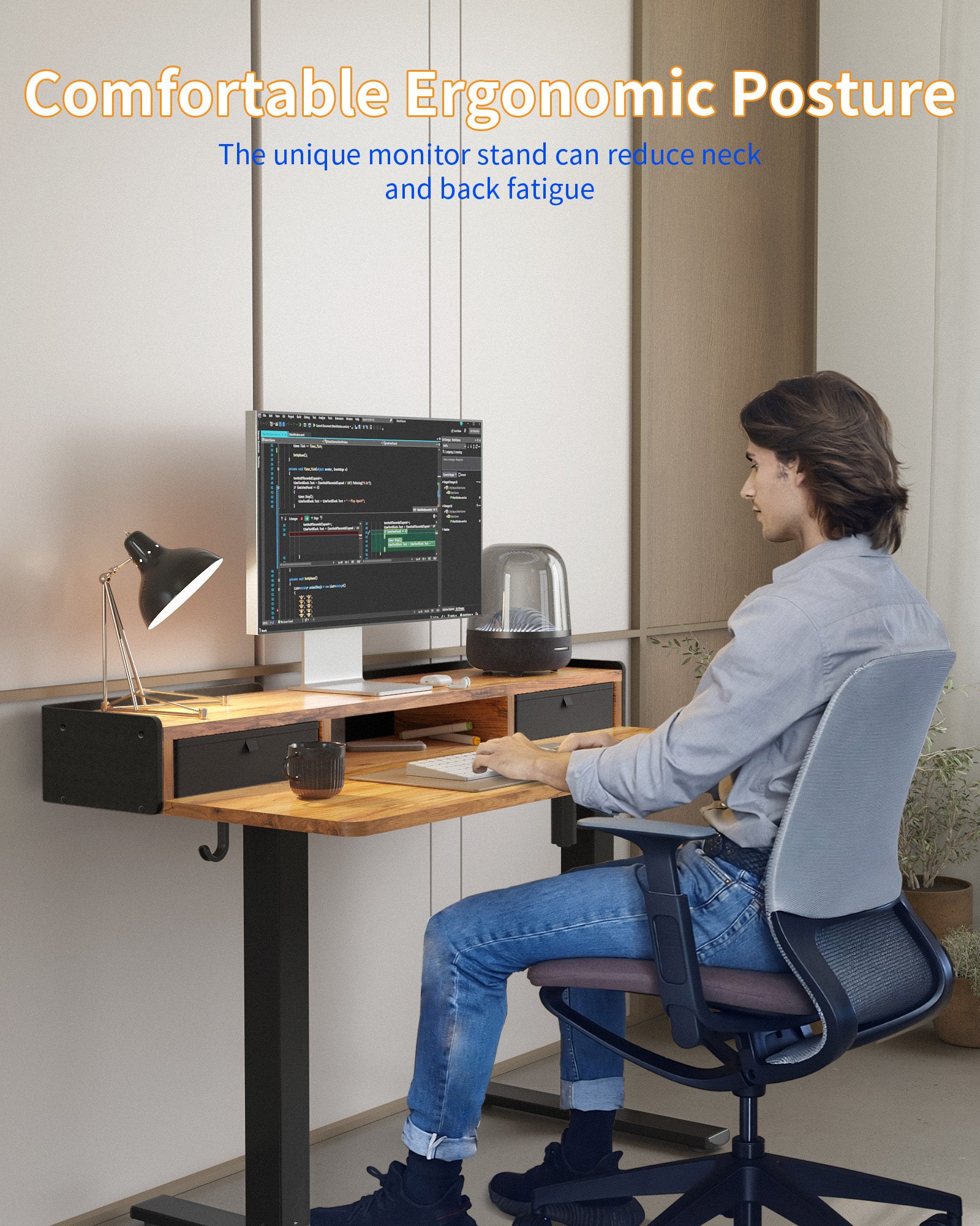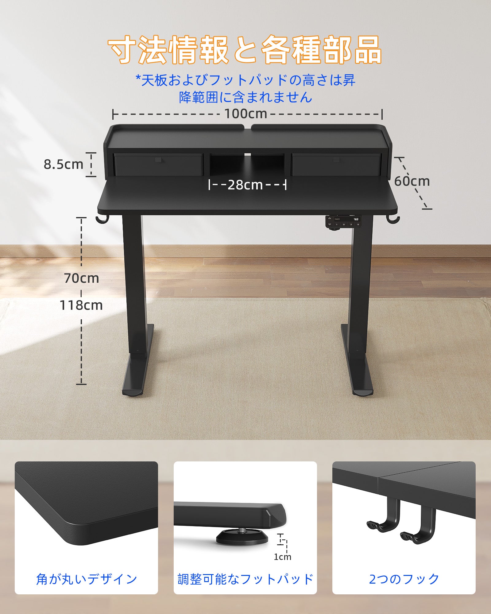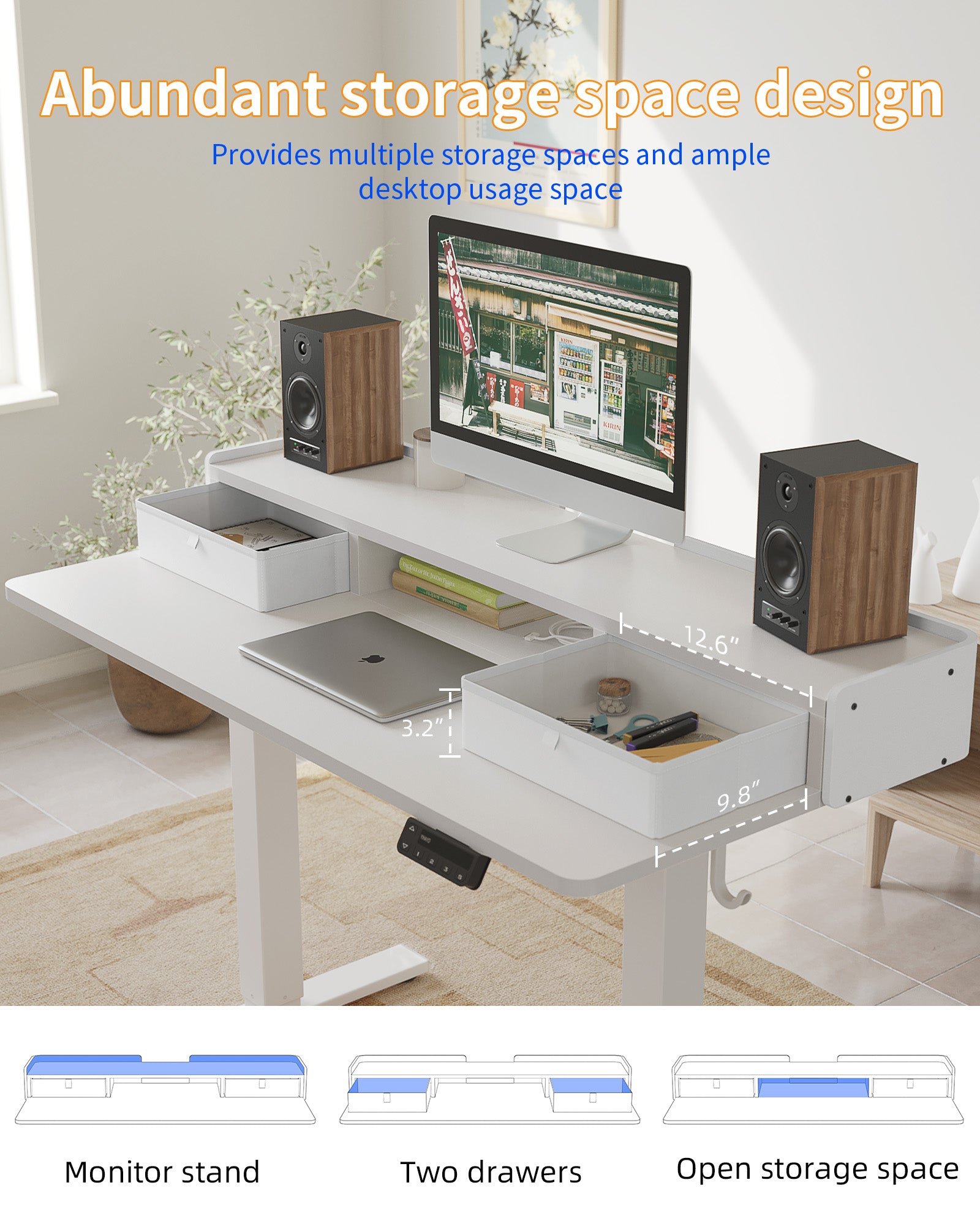 YIHAYOの電動昇降デスクには、モニターなどのデバイスを置くためのモニタースタンドがあり、視線を画面と平行に保つことができ、首や背中の圧力を軽減するのに役立ちます。二つの布製の引き出しがあなたの物をたっぷりと収納するスペースを提供し、ファイル、本、ケーブルなどを収納することができ、デスクを整理整頓された状態に保つのに役立ちます。この昇降デスクには、ヘッドフォンフックやデスクトップケーブル収納穴も装備され、整理されたワークスペースを作り出すことができます