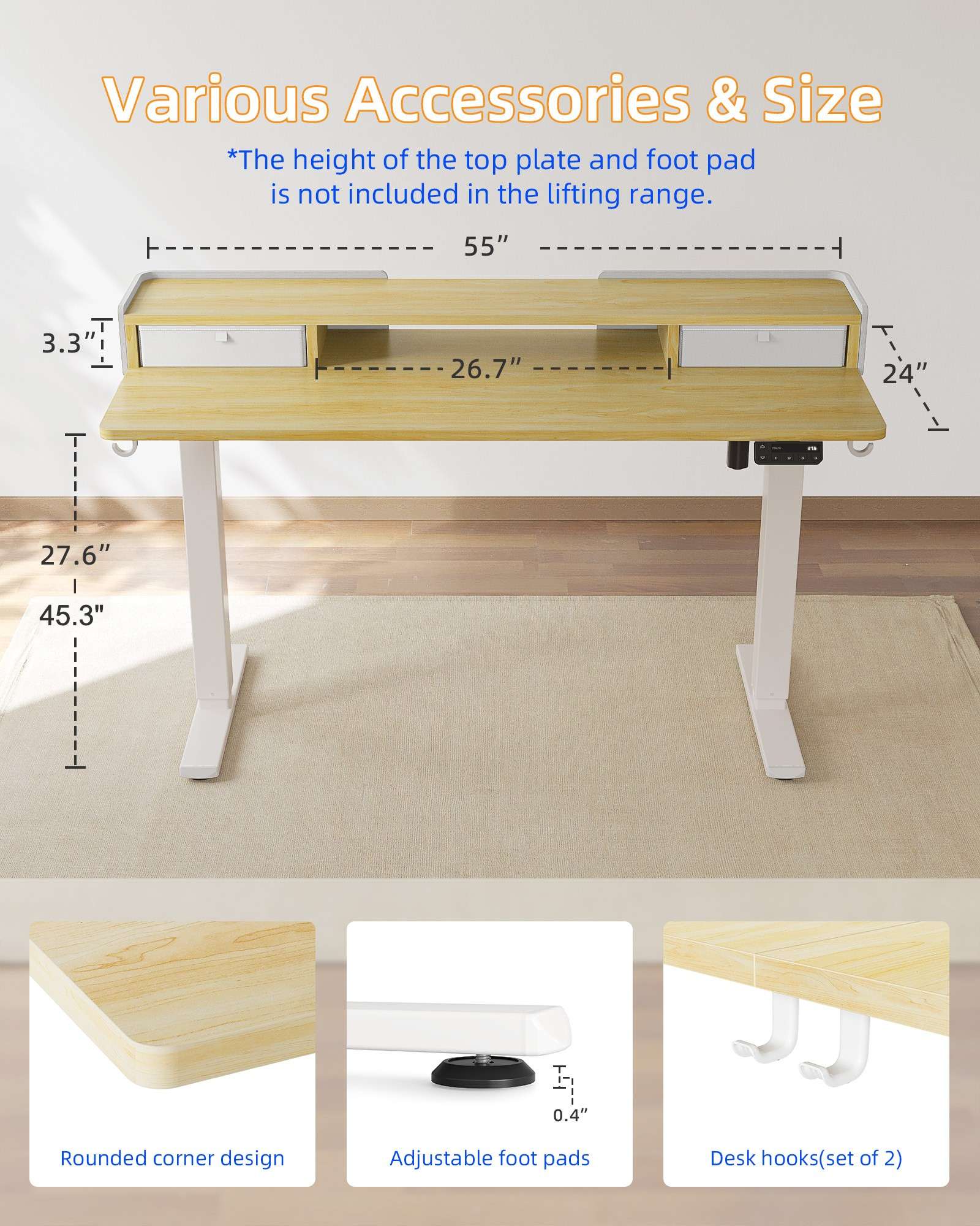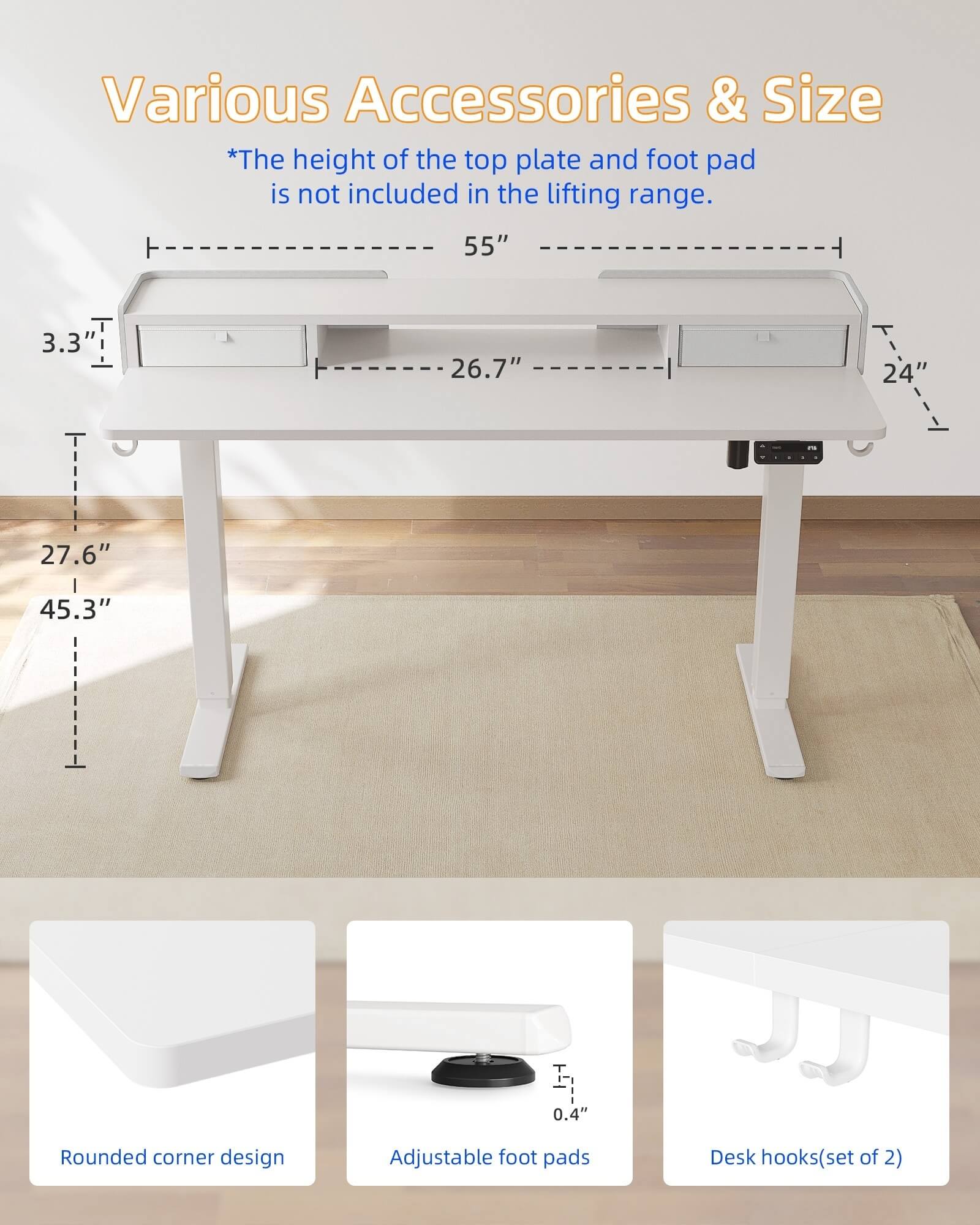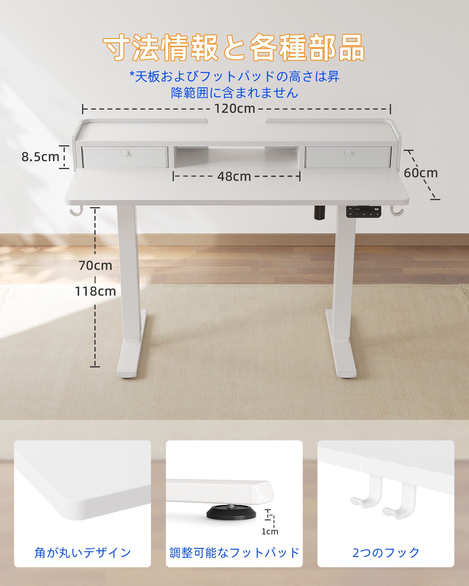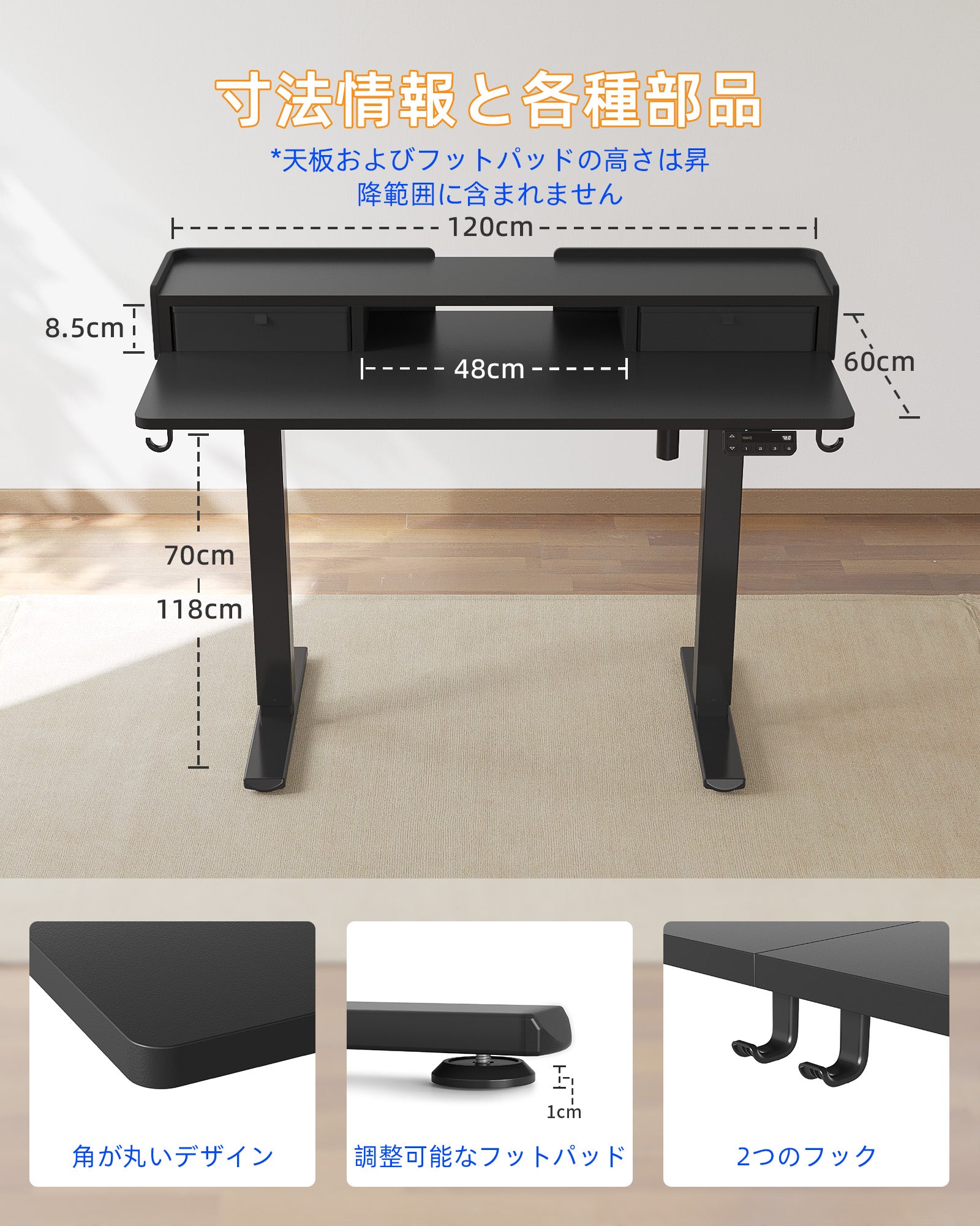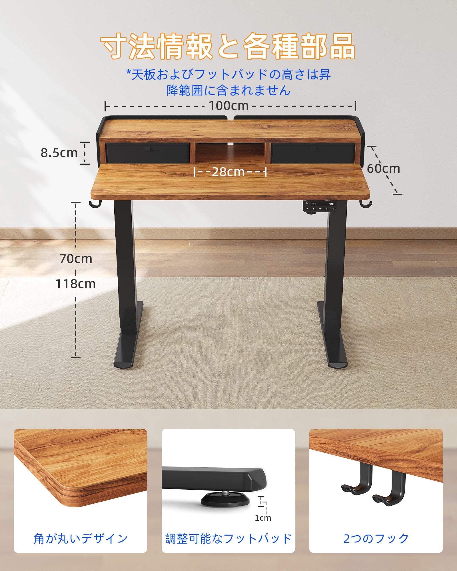 YIHAYOの電動昇降デスクには、モニターなどのデバイスを置くためのモニタースタンドがあり、視線を画面と平行に保つことができ、首や背中の圧力を軽減するのに役立ちます。二つの布製の引き出しがあなたの物をたっぷりと収納するスペースを提供し、ファイル、本、ケーブルなどを収納することができ、デスクを整理整頓された状態に保つのに役立ちます。この昇降デスクには、ヘッドフォンフックやデスクトップケーブル収納穴も装備され、整理されたワークスペースを作り出すことができます