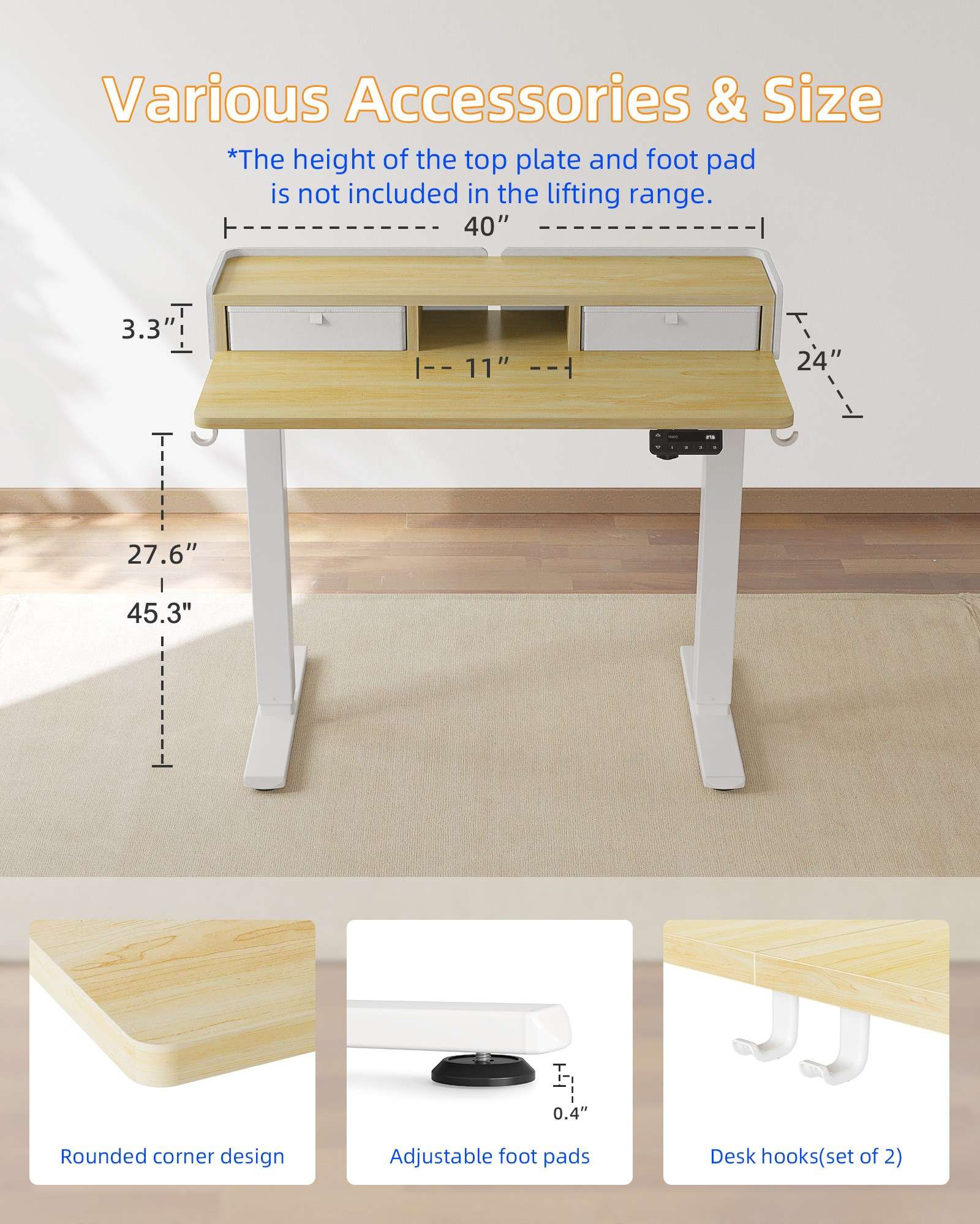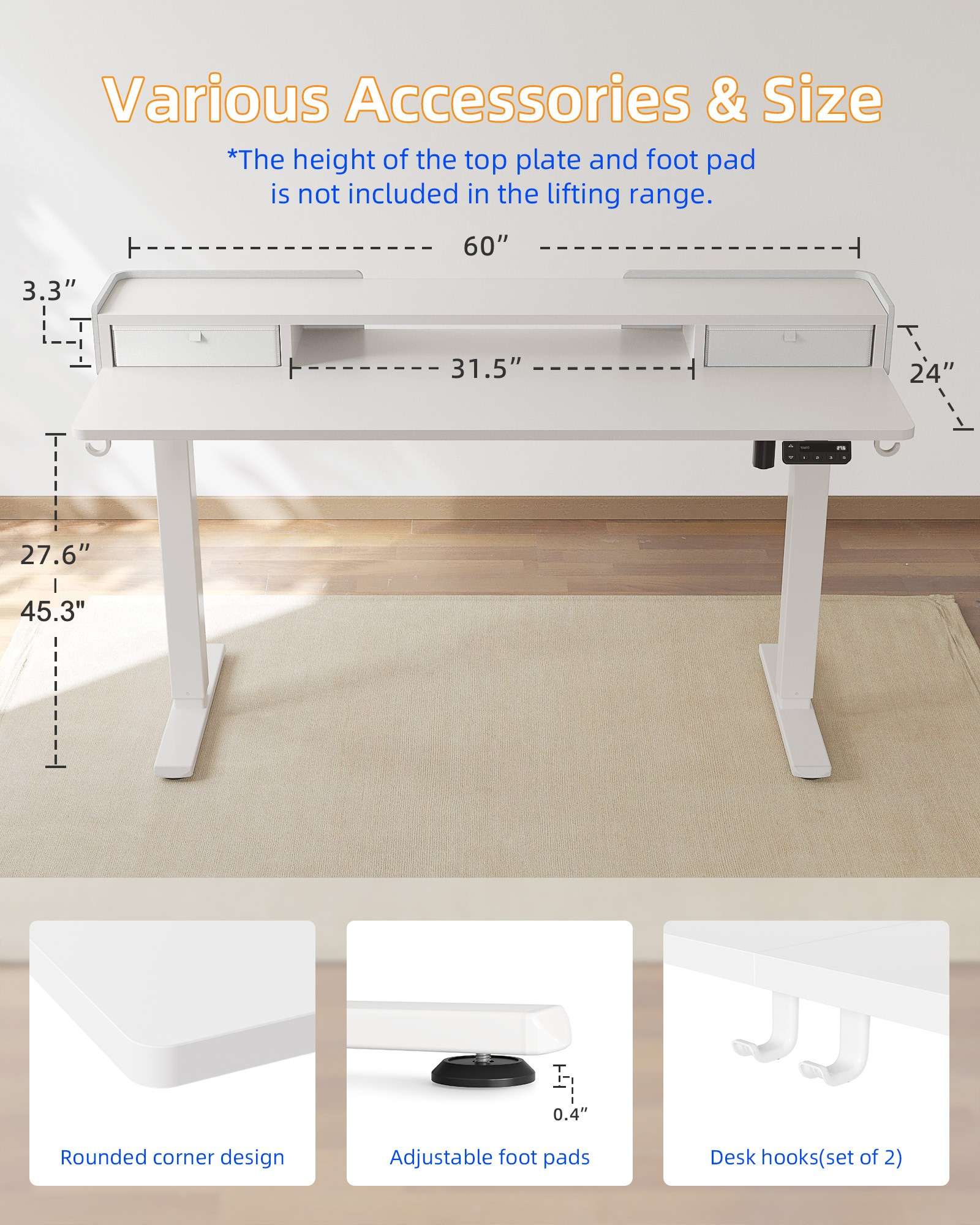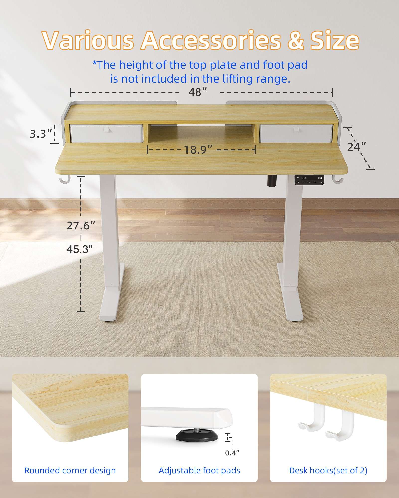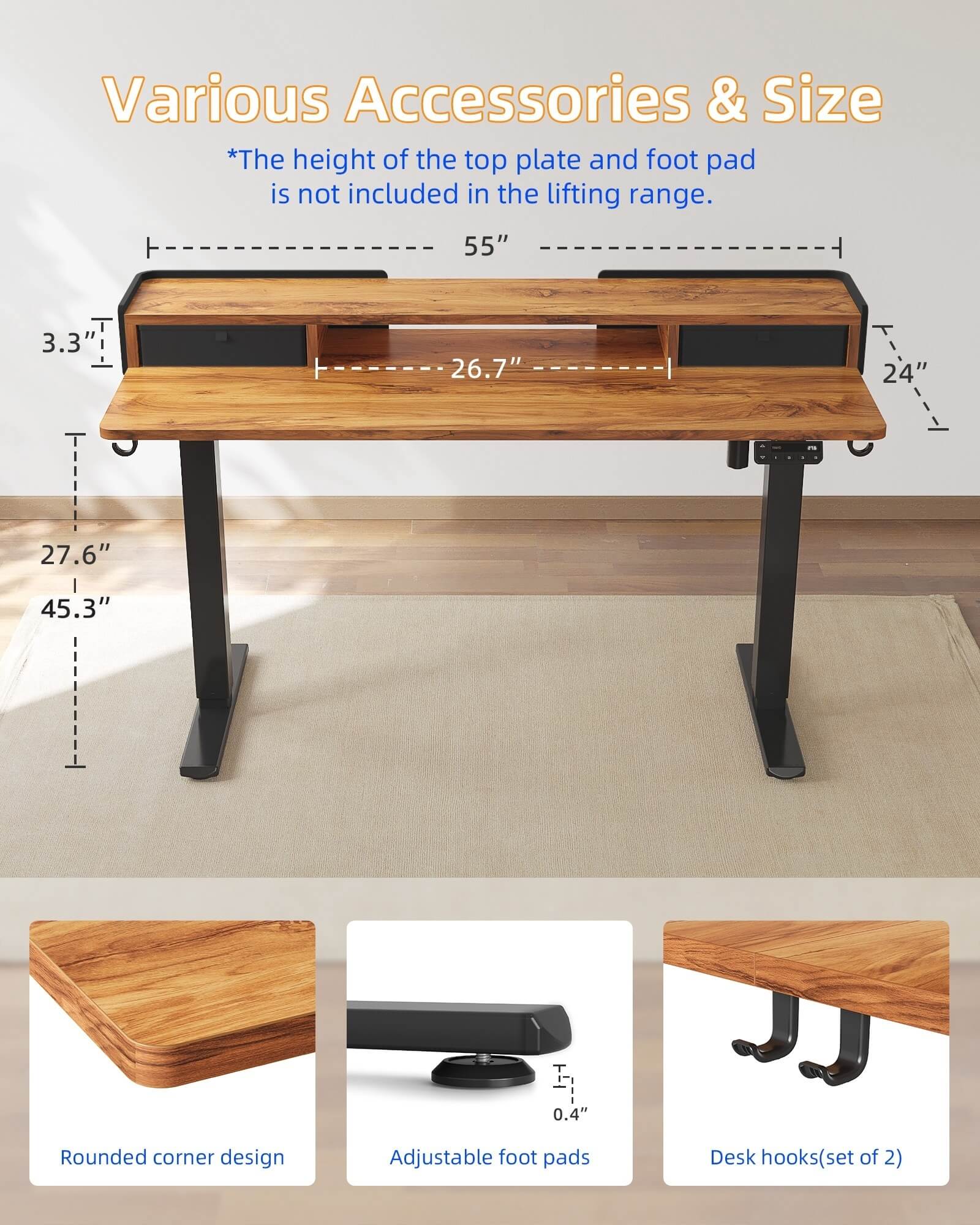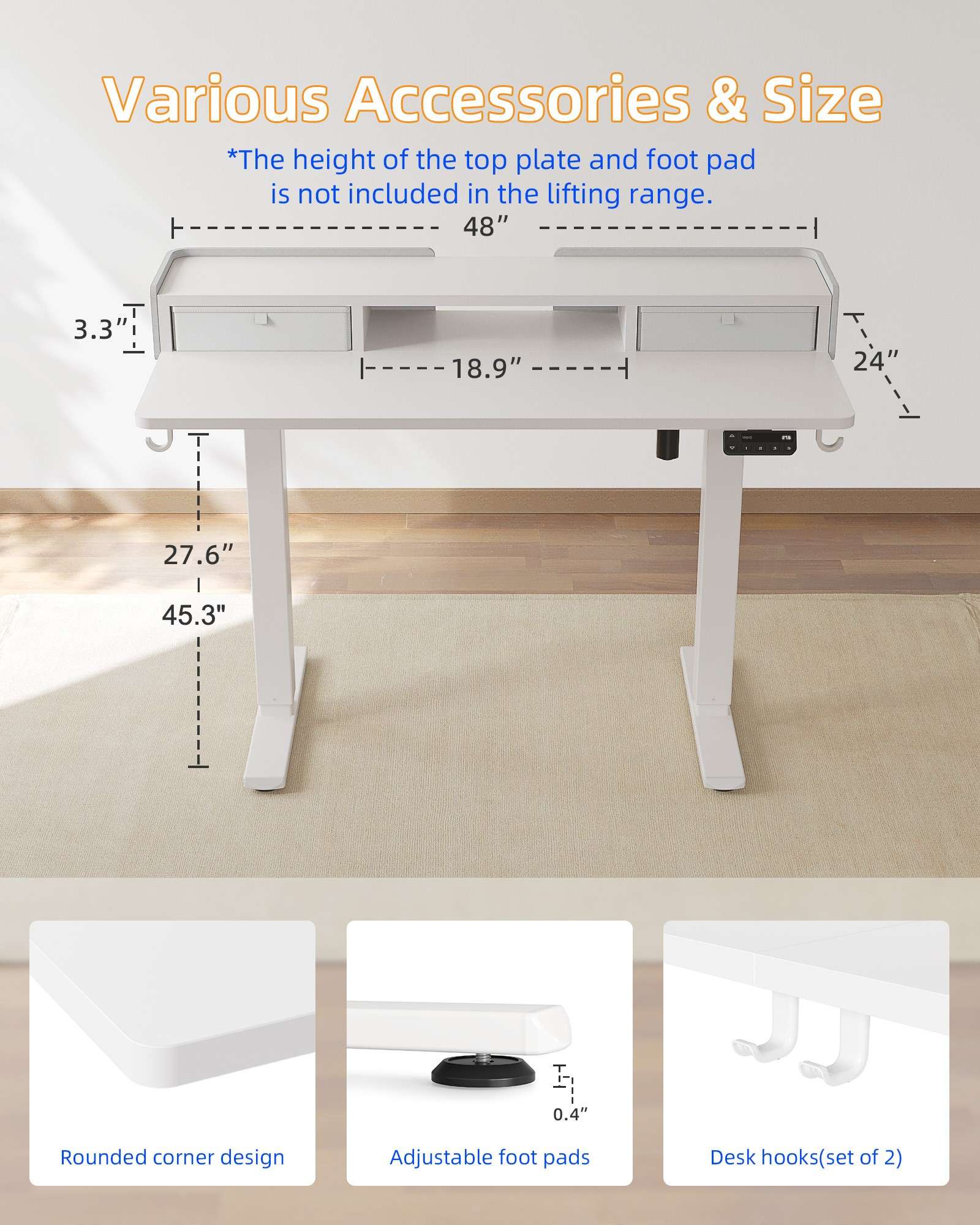 YIHAYOの電動昇降デスクには、モニターなどのデバイスを置くためのモニタースタンドがあり、視線を画面と平行に保つことができ、首や背中の圧力を軽減するのに役立ちます。二つの布製の引き出しがあなたの物をたっぷりと収納するスペースを提供し、ファイル、本、ケーブルなどを収納することができ、デスクを整理整頓された状態に保つのに役立ちます。この昇降デスクには、ヘッドフォンフックやデスクトップケーブル収納穴も装備され、整理されたワークスペースを作り出すことができます