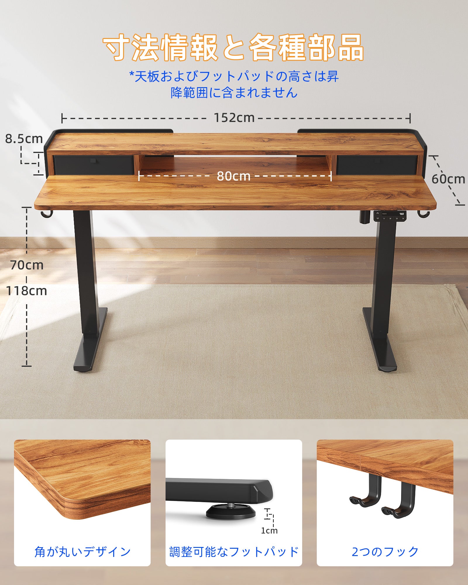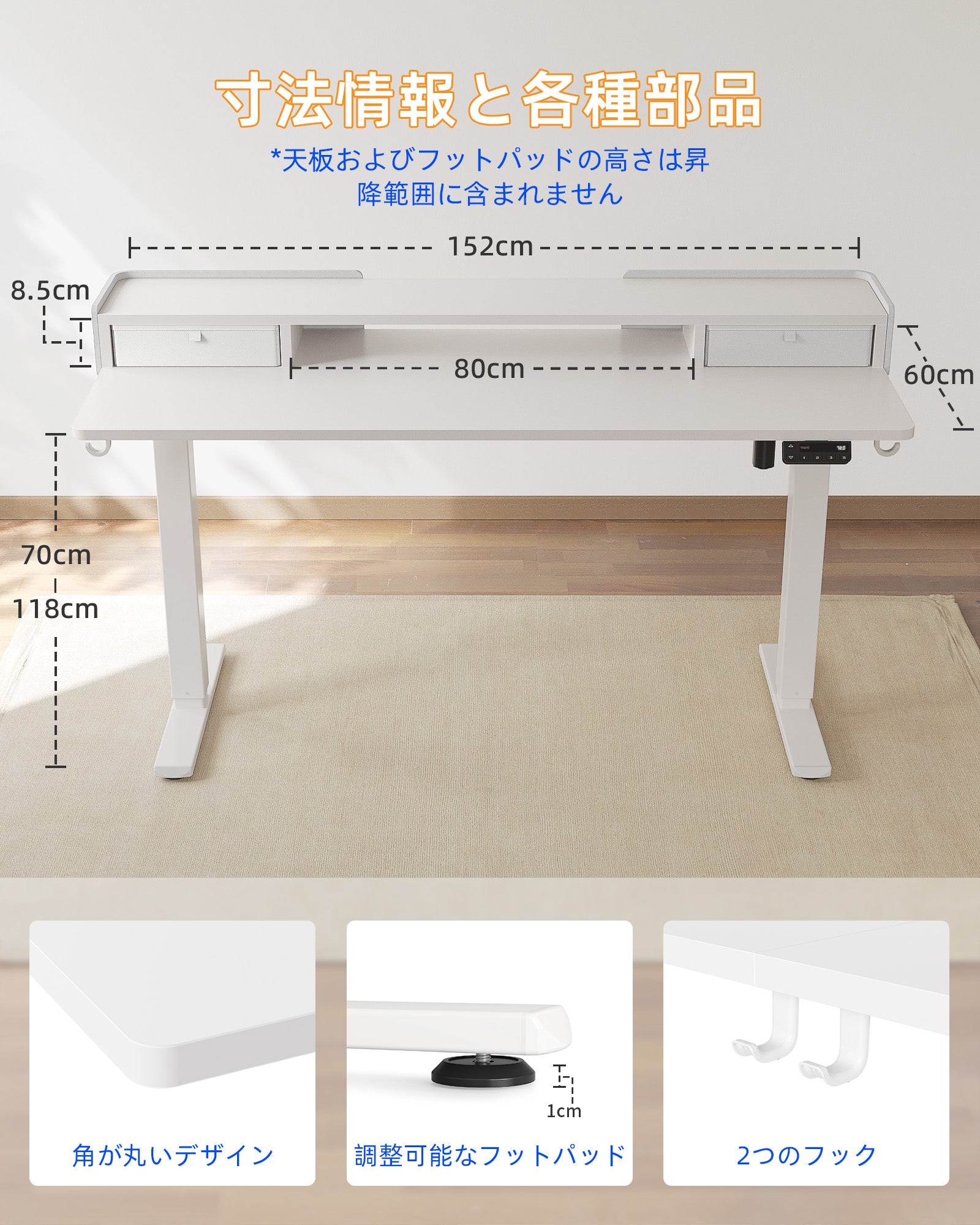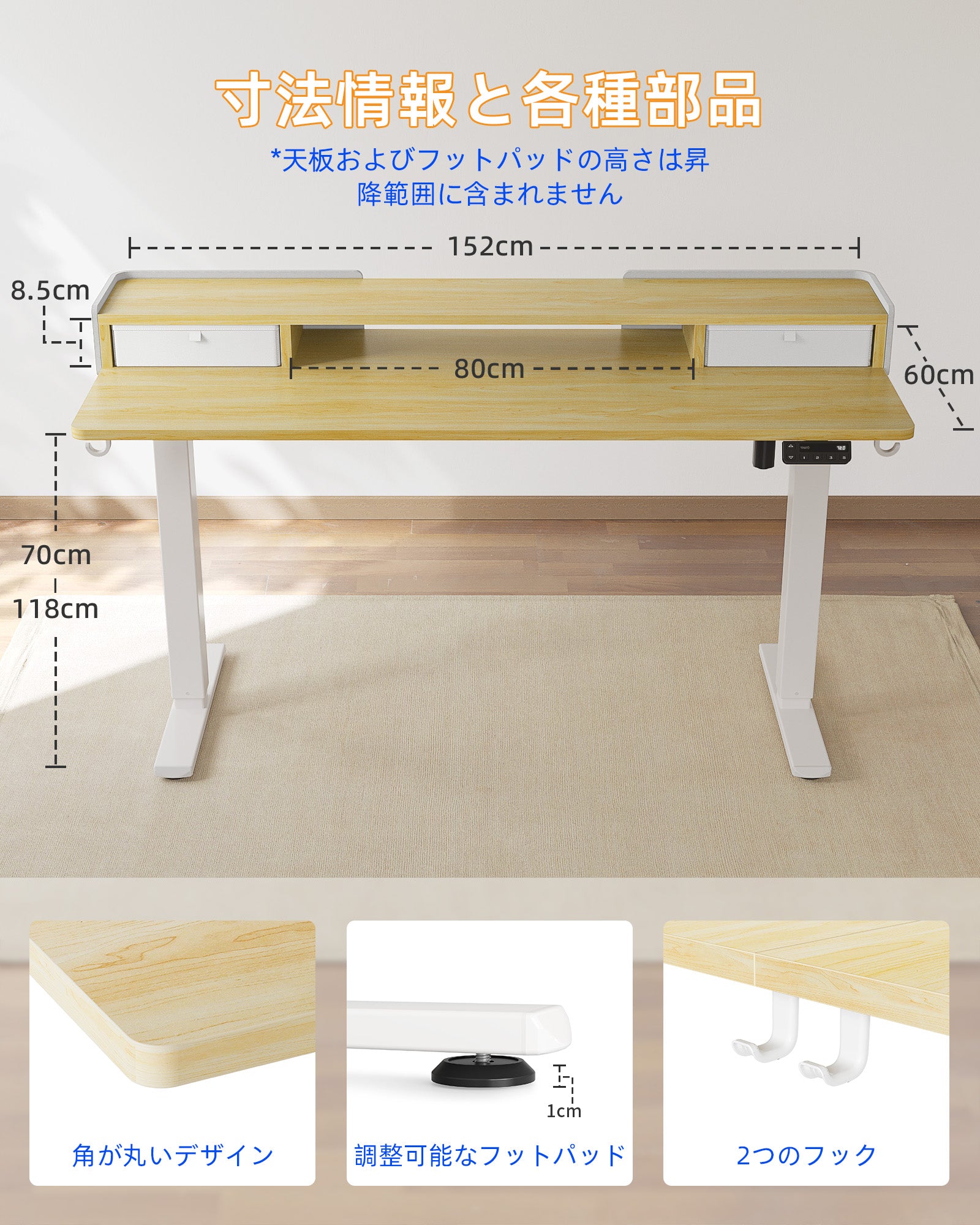 YIHAYO電動昇降デスクは、152x60cmの非常に広々とした作業台を提供します。優れた耐荷重能力と垂直昇降ドライブを備えており、デスクトップは最大70KGの負荷能力を持っています