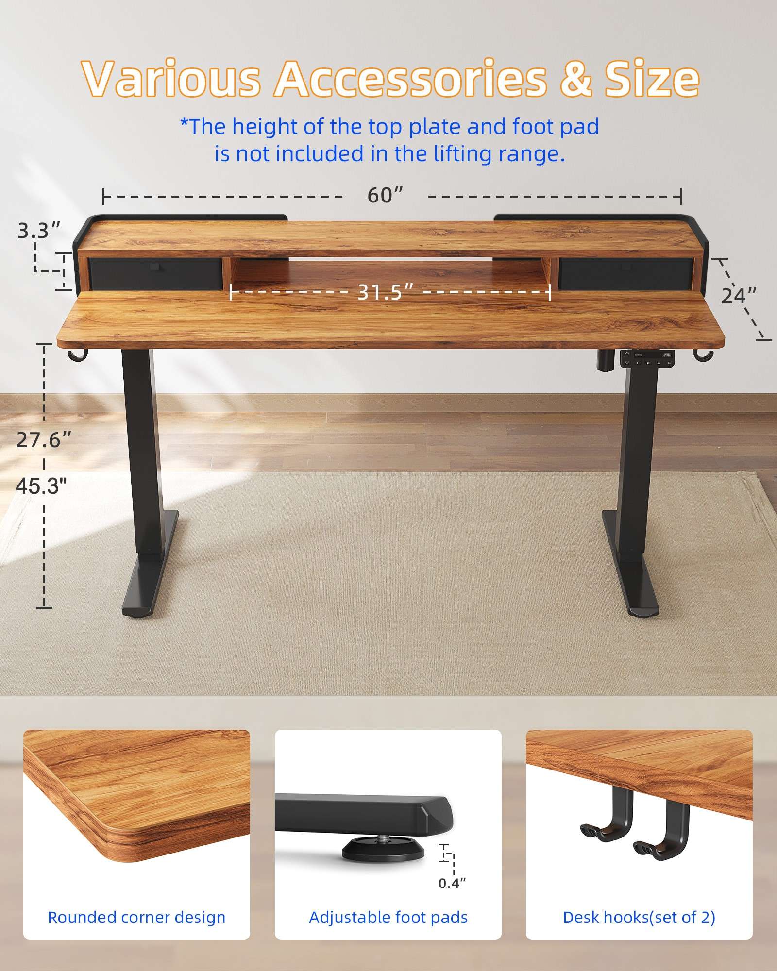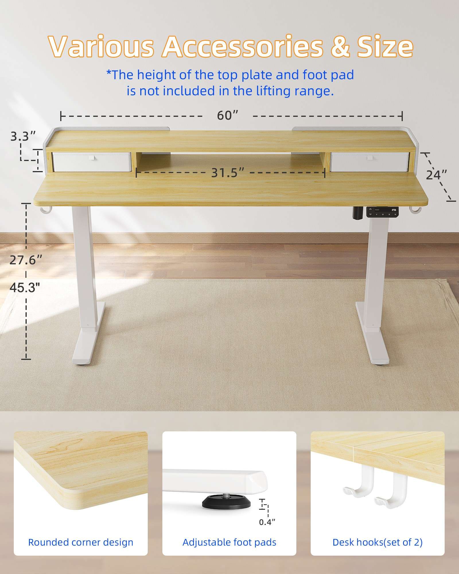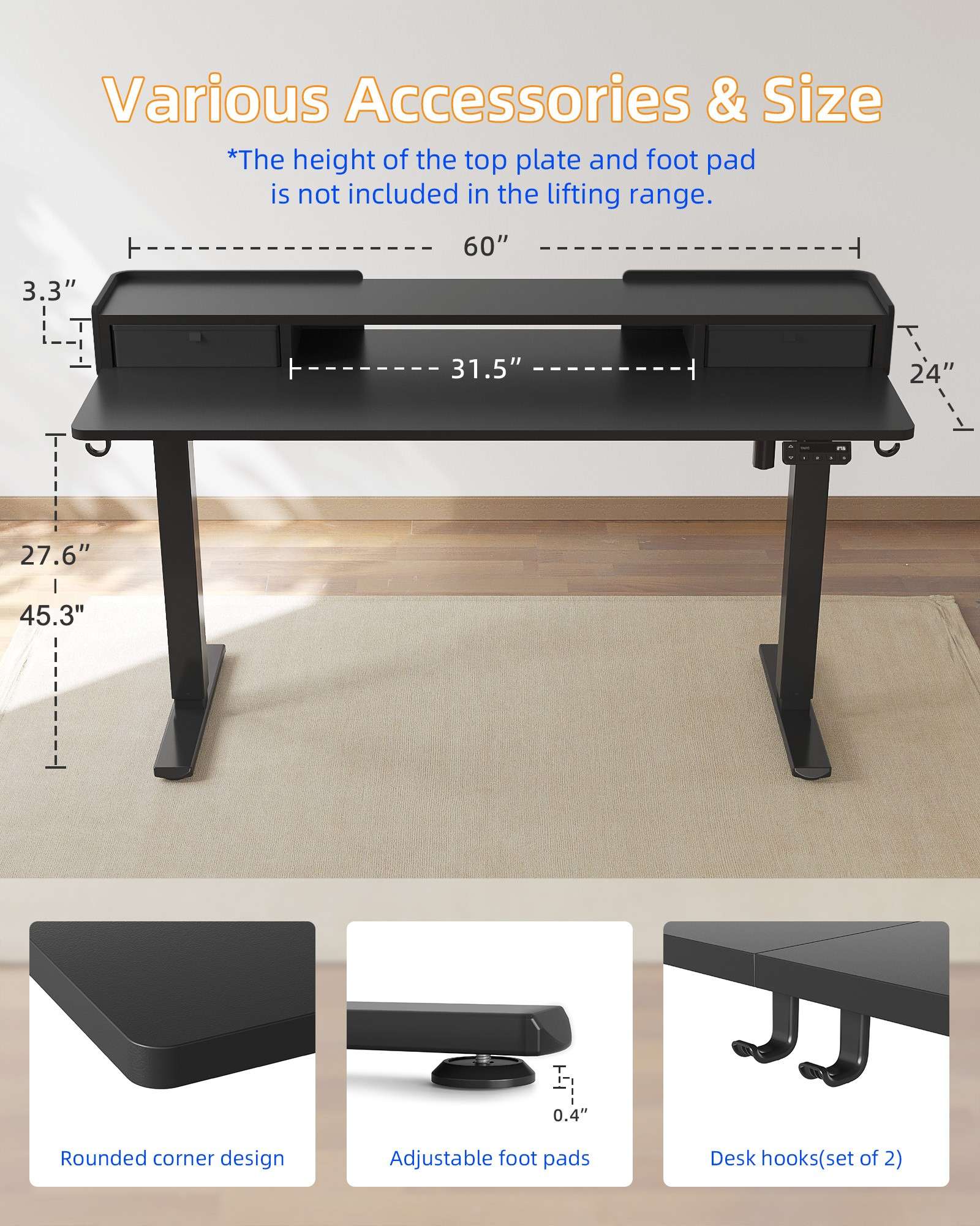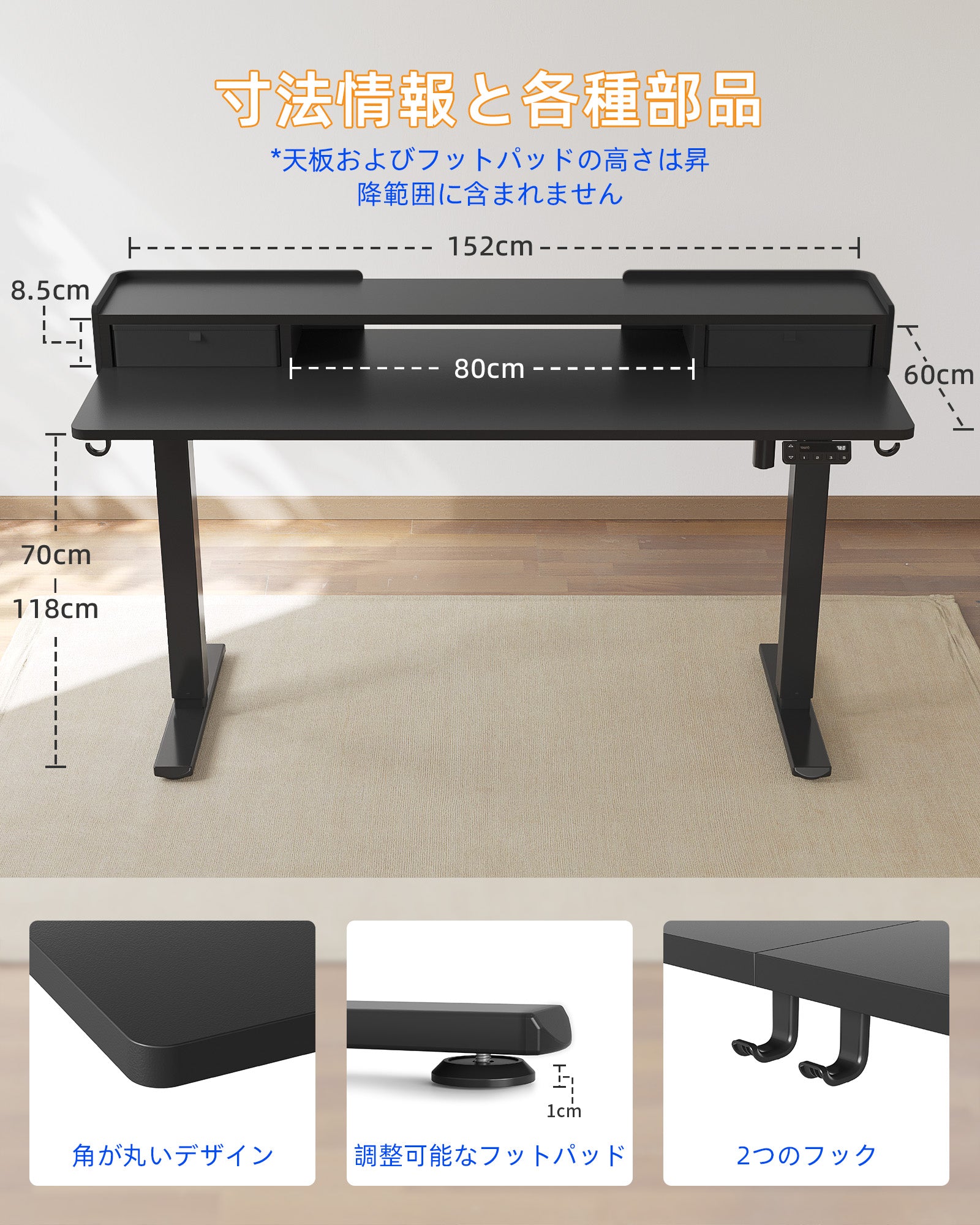 YIHAYO電動昇降デスクは、152x60cmの非常に広々とした作業台を提供します。優れた耐荷重能力と垂直昇降ドライブを備えており、デスクトップは最大70KGの負荷能力を持っています