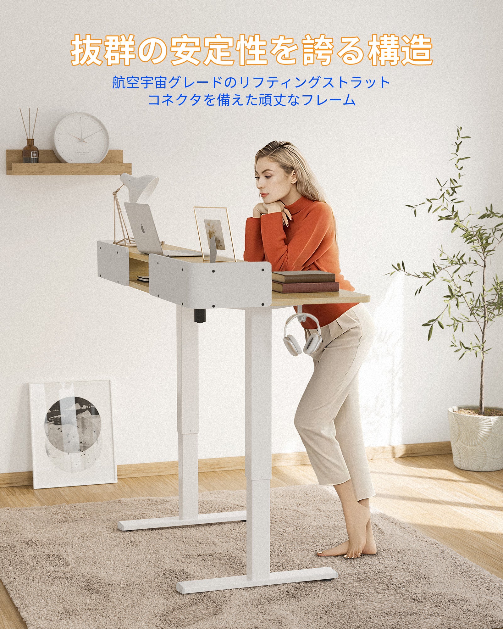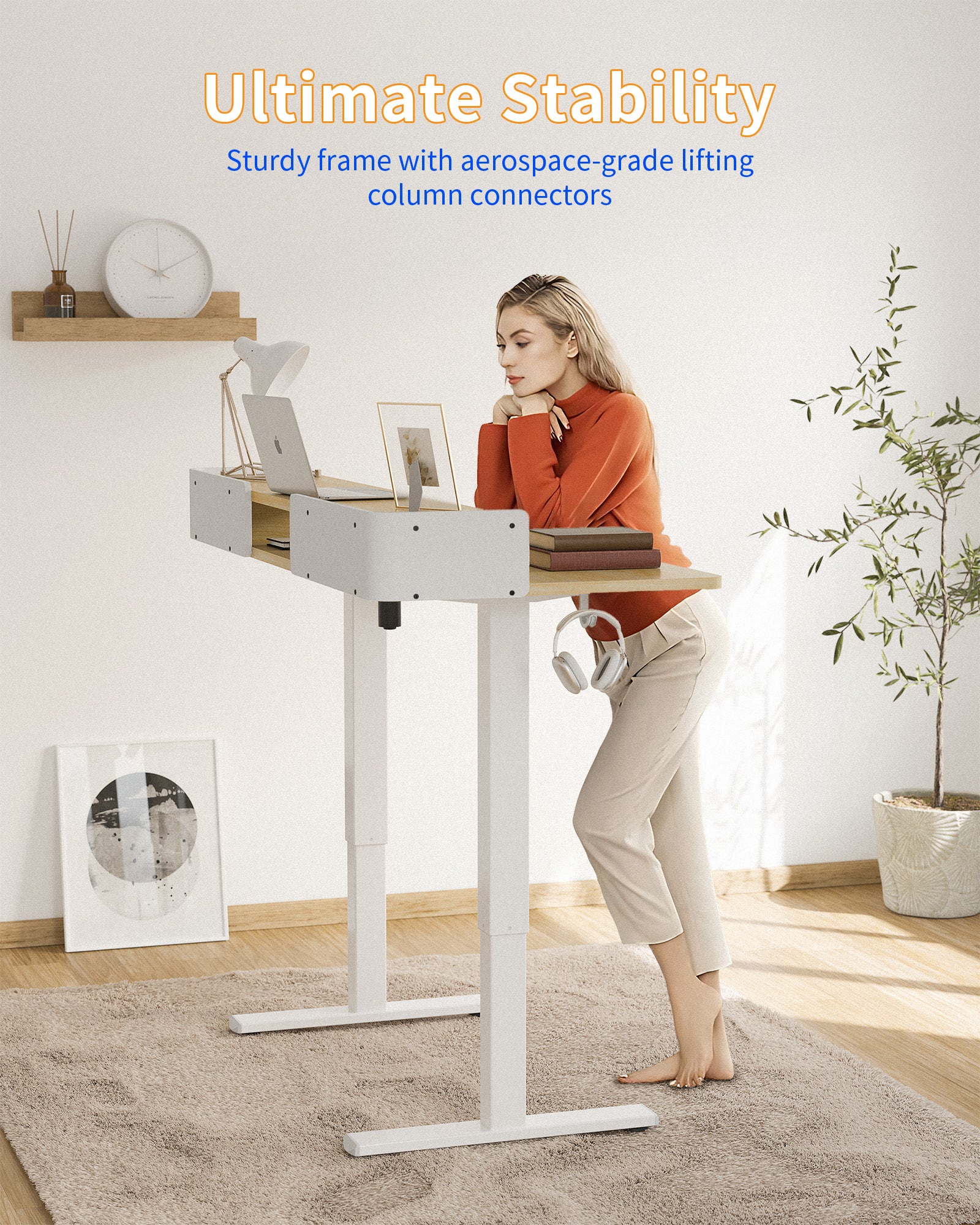 この電動昇降式デスクは、堅牢な鋼製フレームと航空レベルの昇降コラムコネクターを採用し、5万回のテスト後も安定して安全な性能を維持し、最大高さでの使用時も確実に動作します。また、この昇降式デスクは衝突防止技術を搭載しており、センサーが移動経路上の障害物を検知して、昇降式デスクが障害物と接触または擦れてしまうのを効果的に防ぎます。これにより、より安全な使用体験を提供します