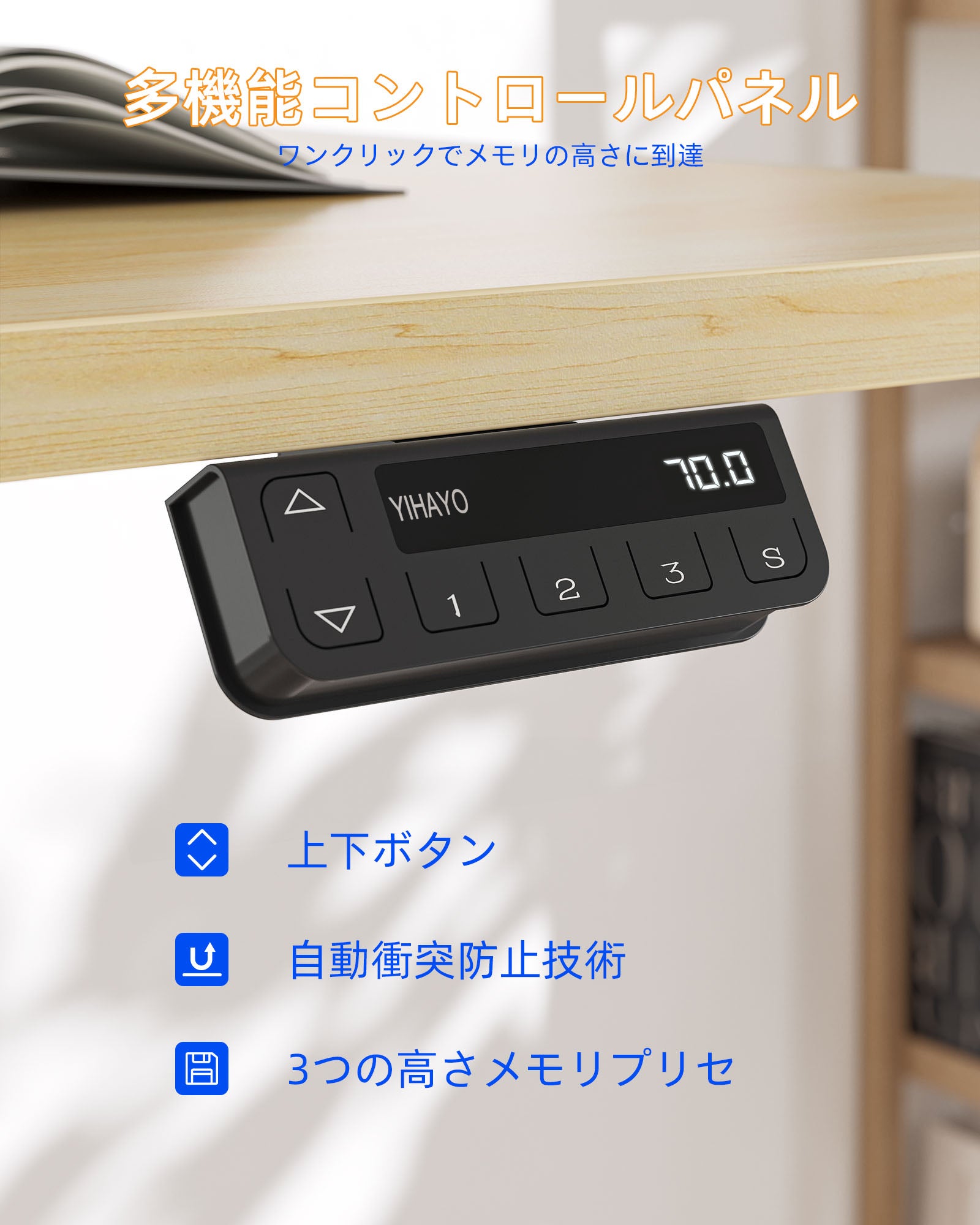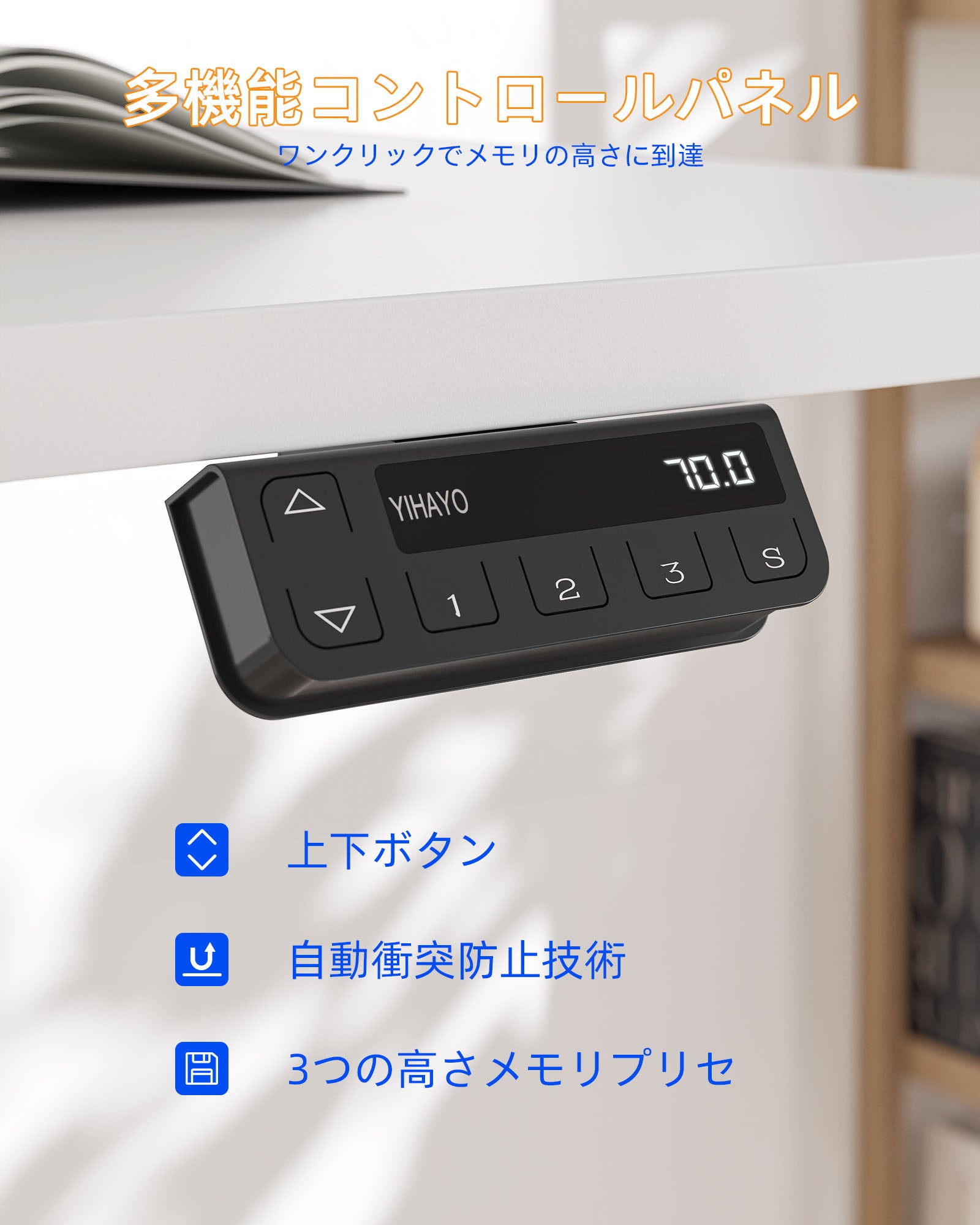 YIHAYOの昇降式デスクは高さを70cmから118cmまで自由に変更することができます。子どもから大人まで、身長や姿勢に合わせて設定可能です。加えて、最大3つの高さを記憶する機能があり、ボタン一つで座位と立位を変えながら、ご自身の好みに合わせた高さに調整することができます